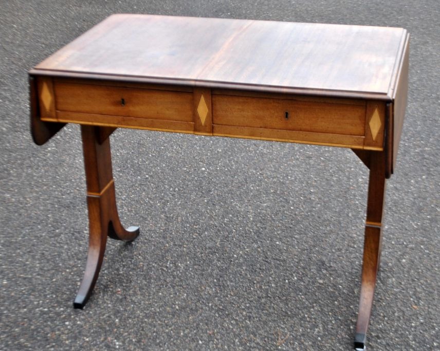 Werktisch mit Klappen aus Mahagoni mit Intarsien, um 1900. Dänemark.