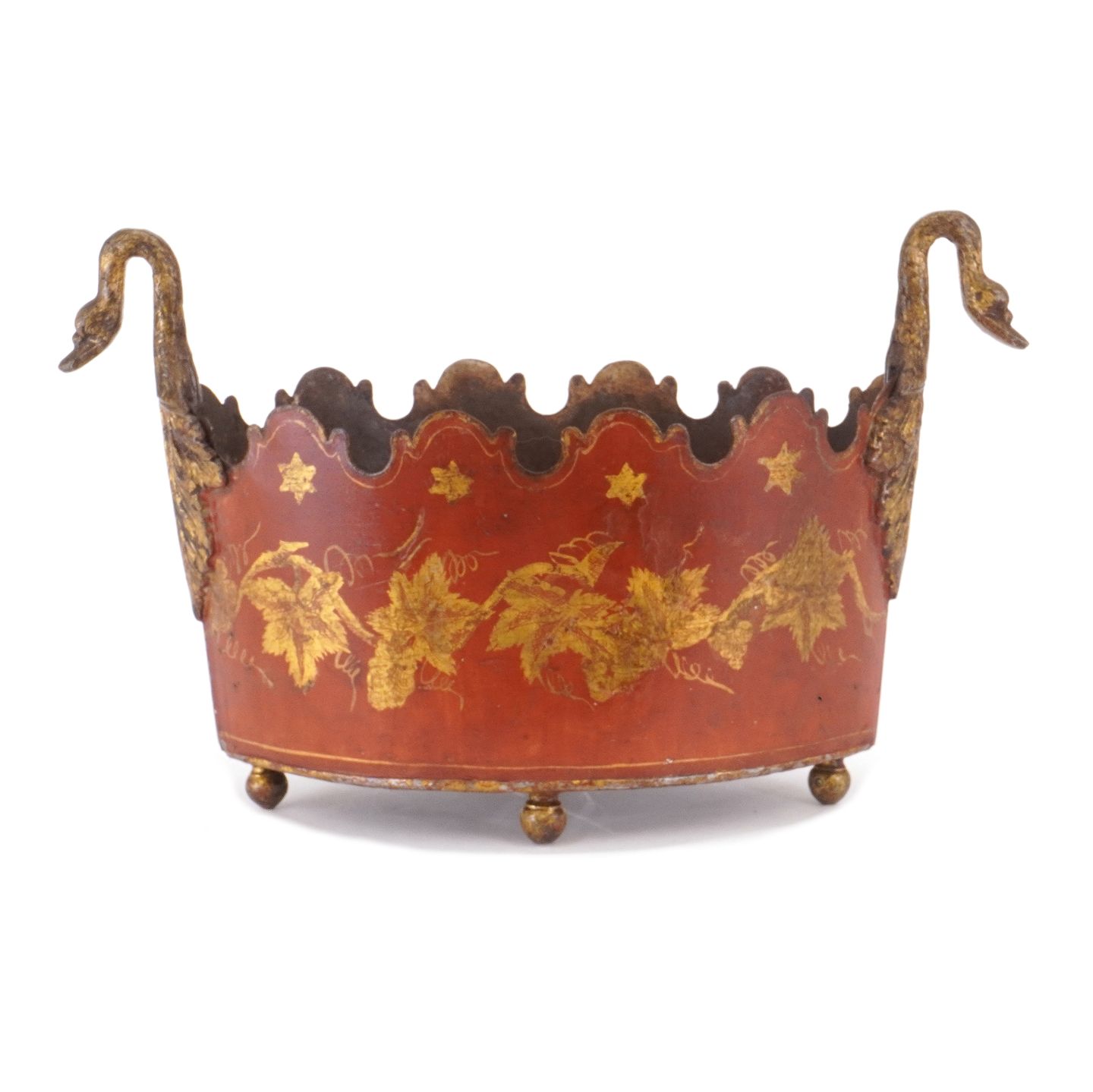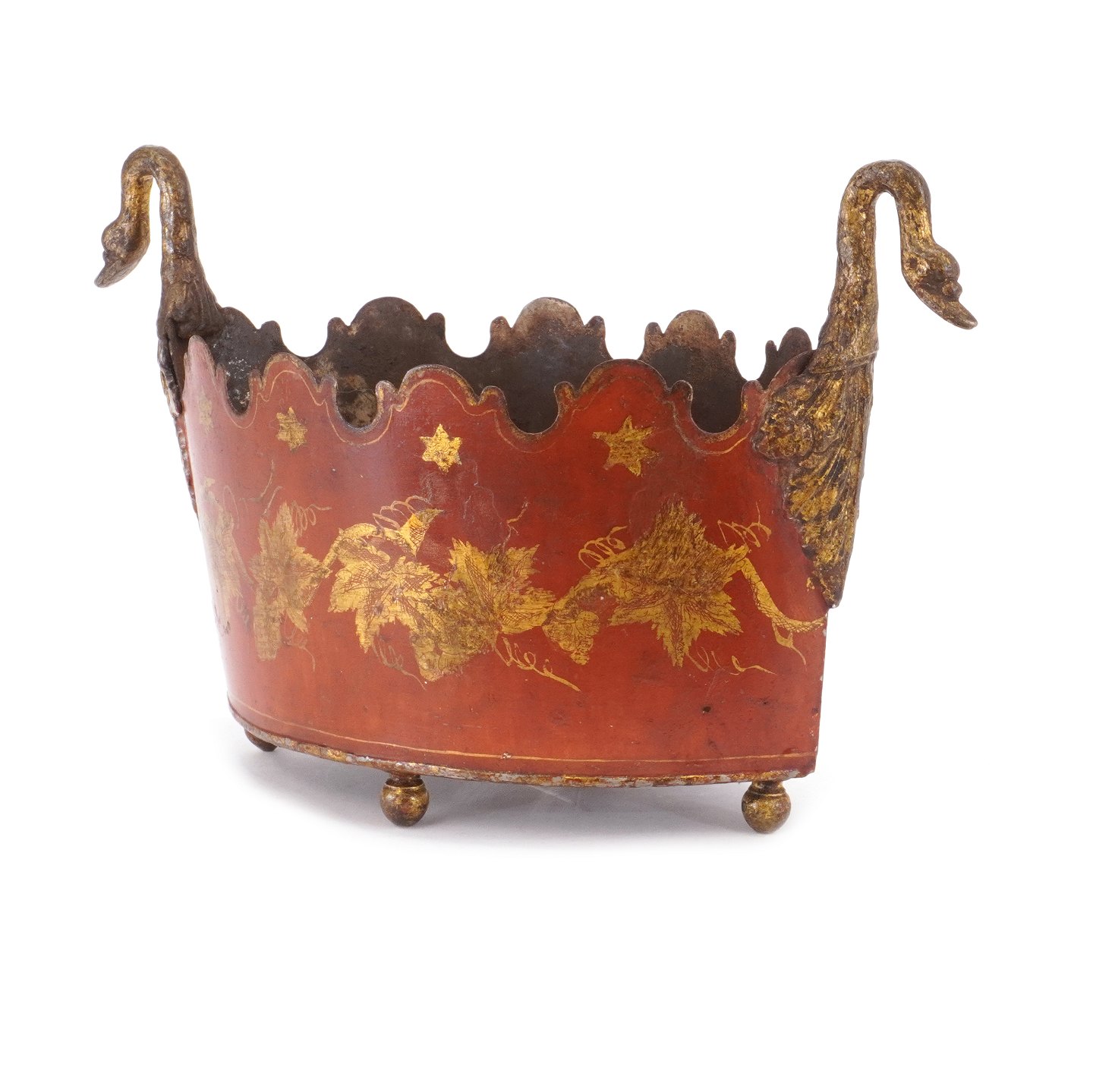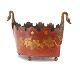 Vergoldeter und rotdekorierter Jardieniere/Blumenübertopf aus Metall. Frankreich um 1840. H: 19cm. L: 31cm