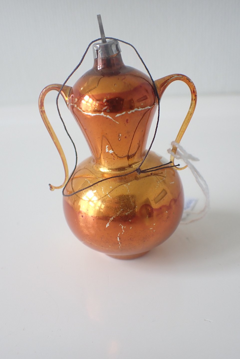 1 Stk. glasjulepynt - 2 hanket lågvase i guldbronze med sølvdekoration. Med ophæng og kan stå. Stammer fra Leipzig tidlig 1900-tal. Højde: 7,2 cm. Bredeste diameter: 4,3 cm. I fin stand.