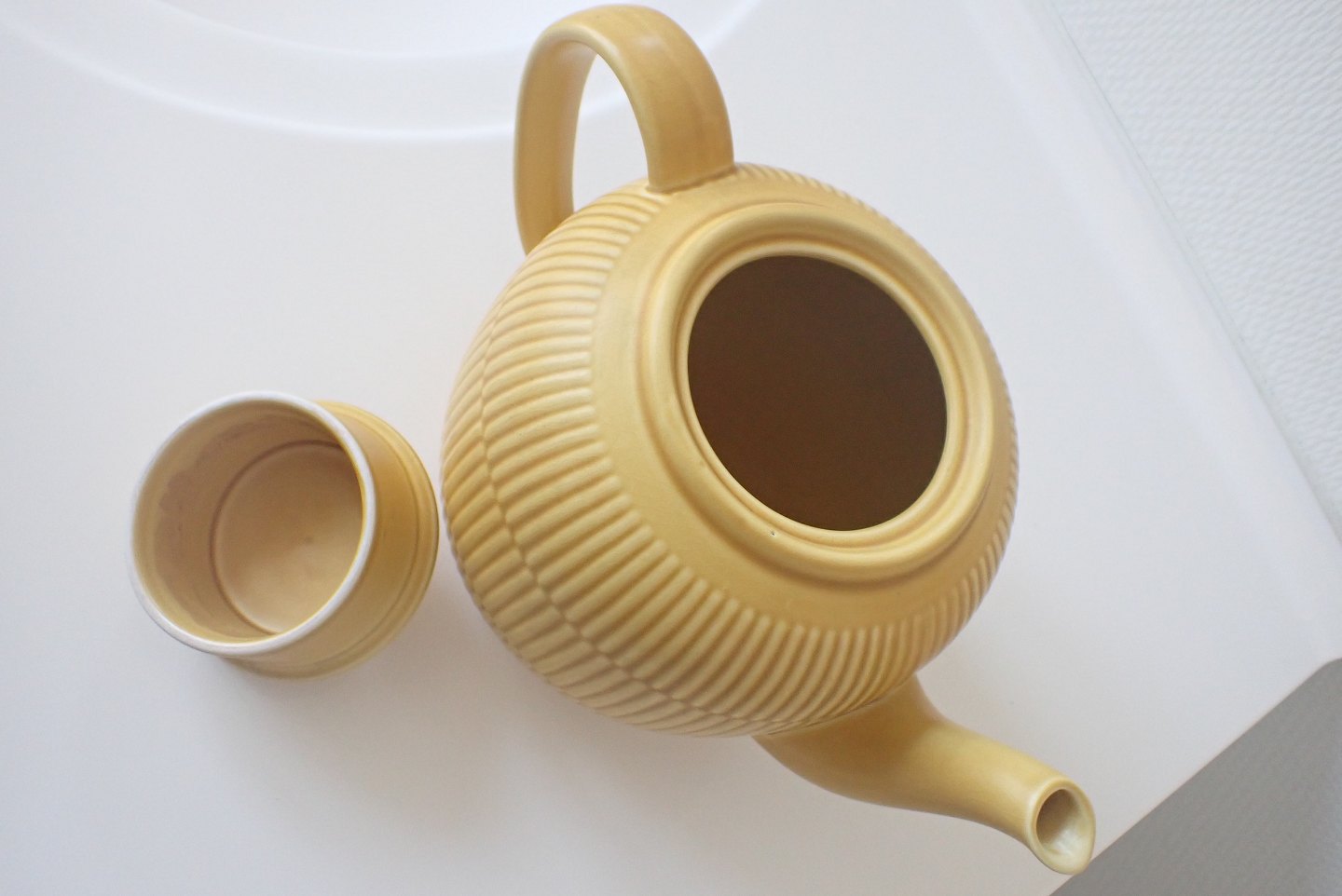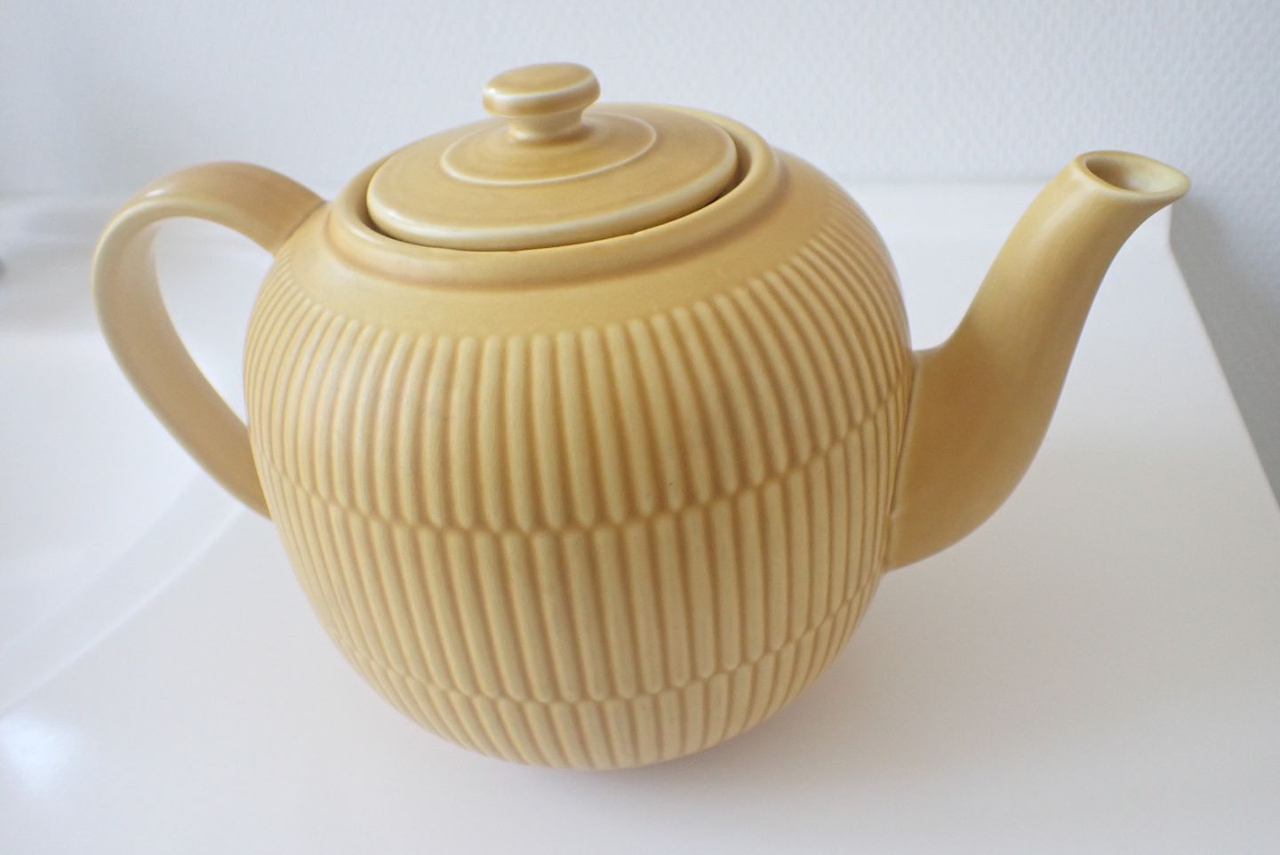 Aluminia - stor Marselis tekande med gul glasur, designet af Nils Thorsson (1940 - 1943). Mål: 15 x 24 cm. I fin nærmest ubrugt stand.