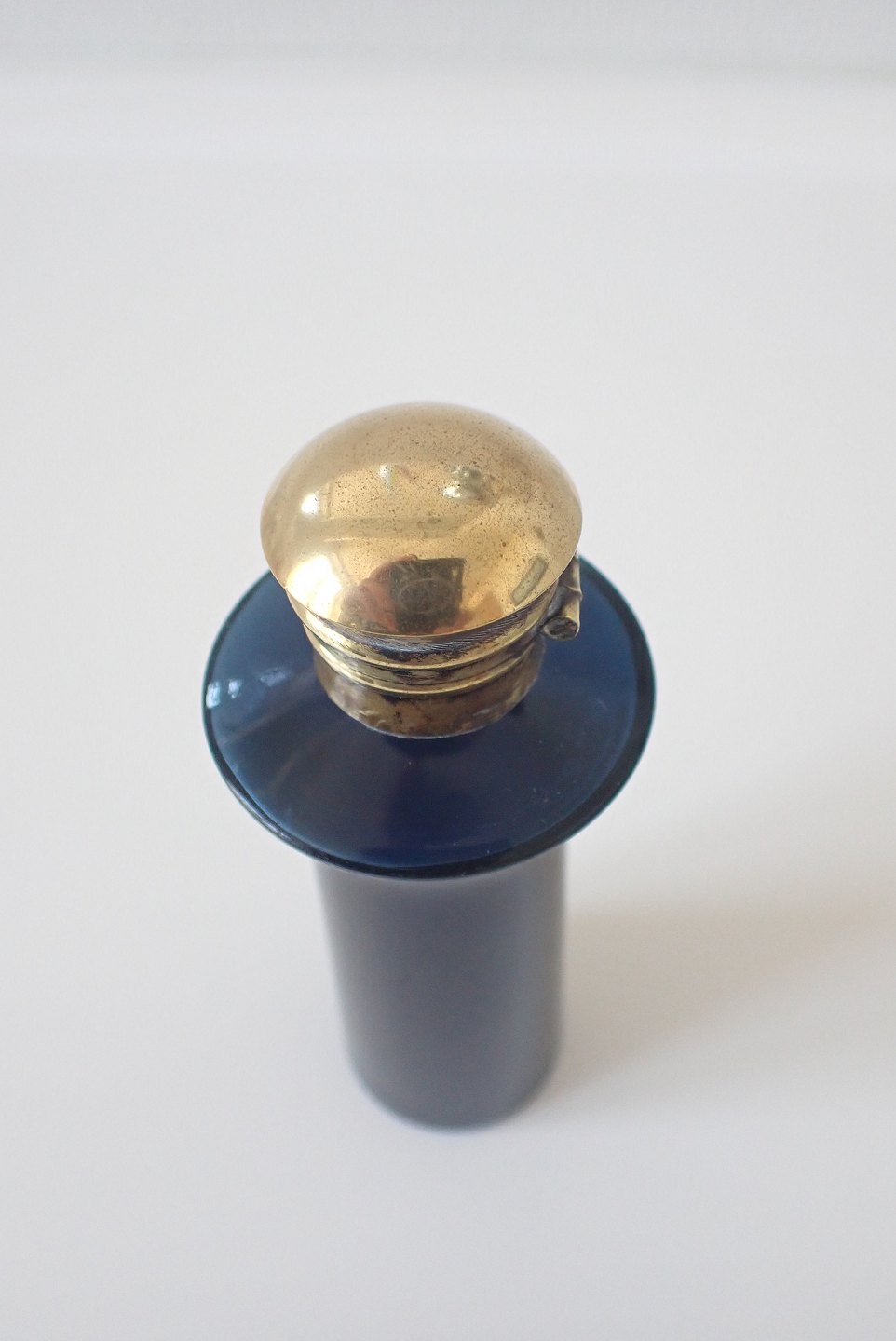 Parfumeflaske i blåt glas med messinglåg, engelsk ca. 1900. Højde:11,5 cm. I fin stand men mangler indre glasprop.