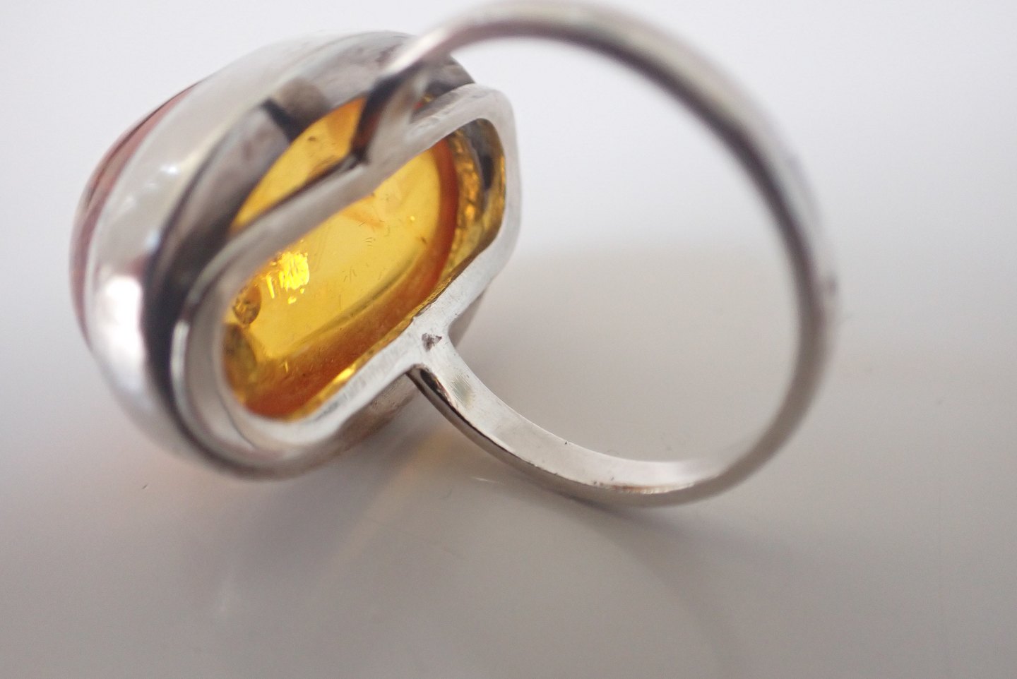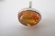 Sterling sølvring med cabochonsleben klart gult rav med indlejrede instekt/smådyr. Ravhuset. 1990.Utydeligt stempel. Str.: 56. Bredde på rav: 1,8 cm. Længde: 2,9 cm. Bredde ringskinne: 0,3 cm.