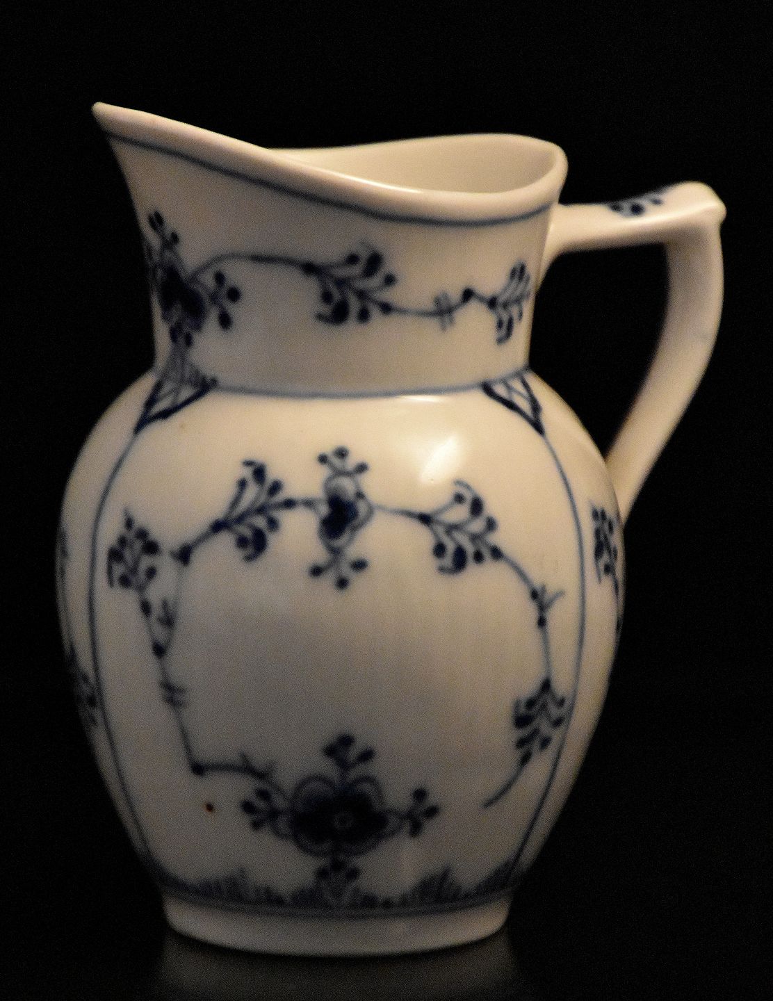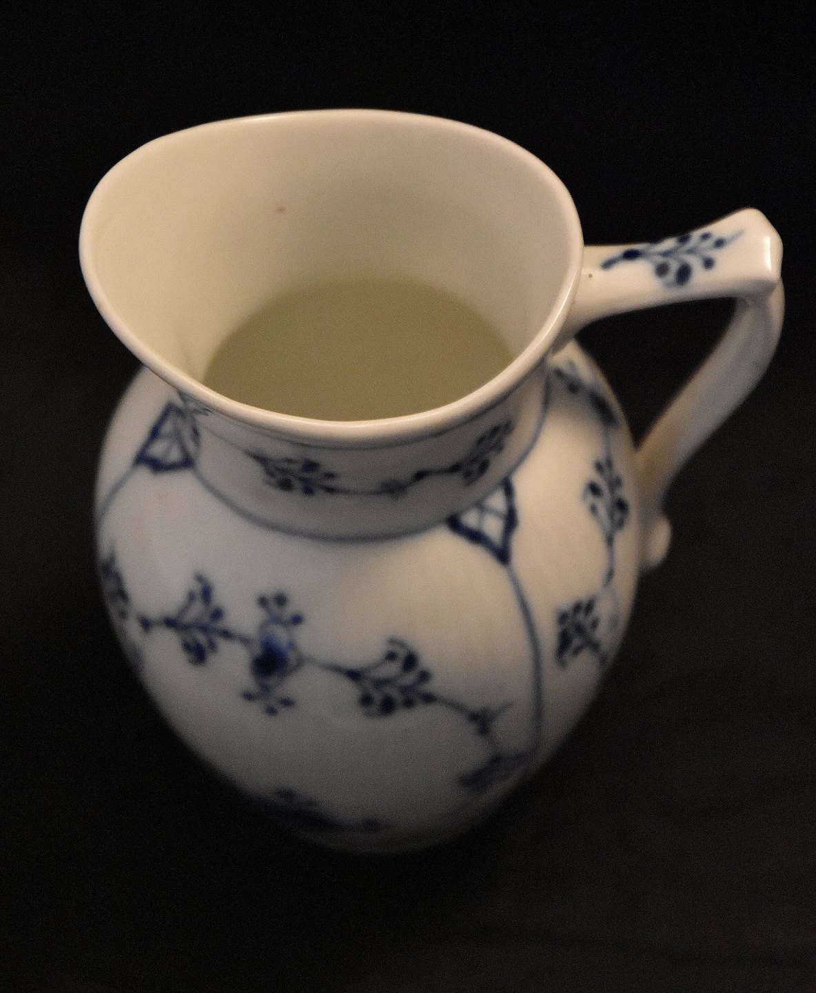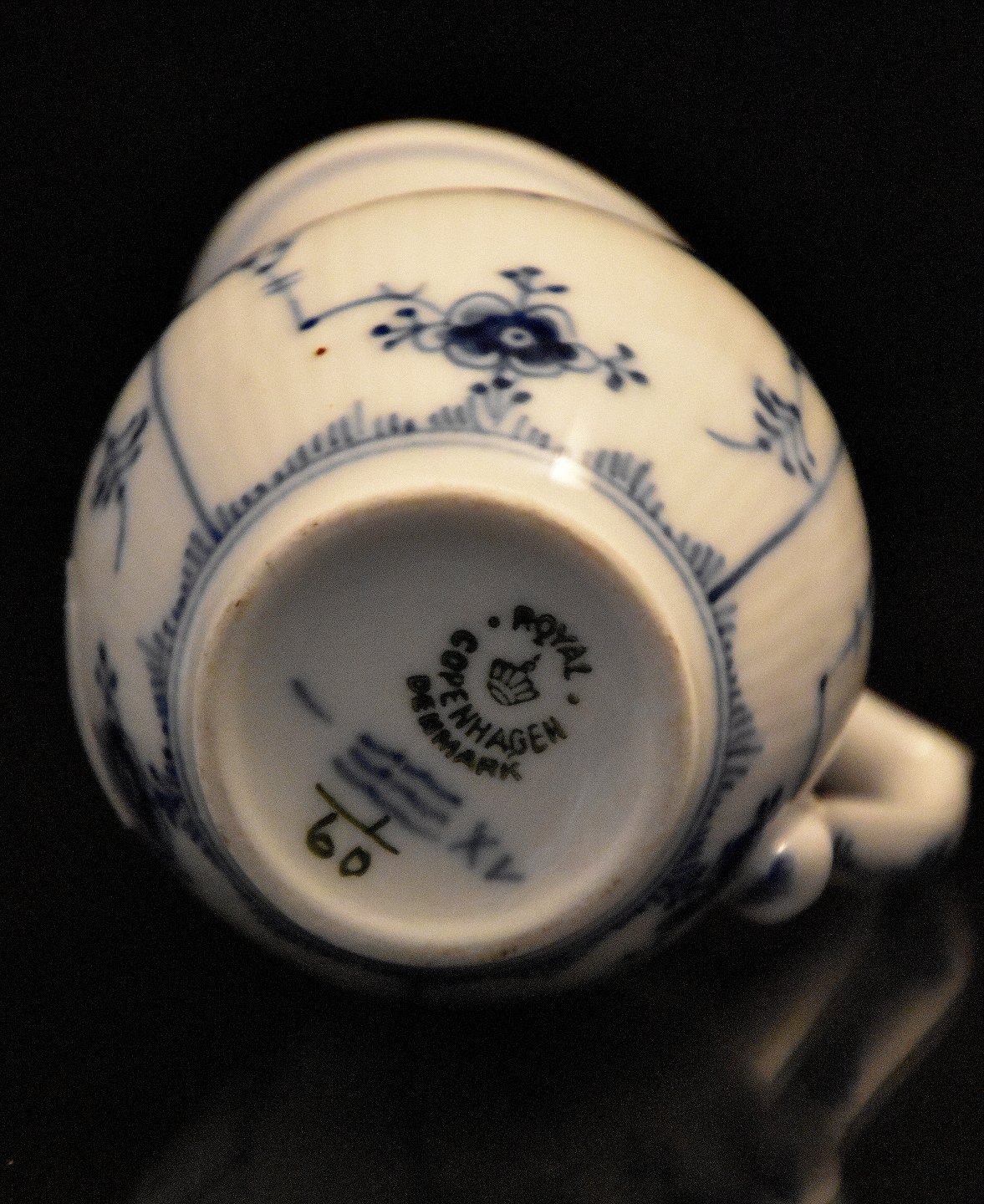Royal Copenhagen flødekande 1/60. Den RC/KGL flødekande er riflet og musselmalet. Den kongelige flødekande måler H.: 10,5cm Ø.: 6cm