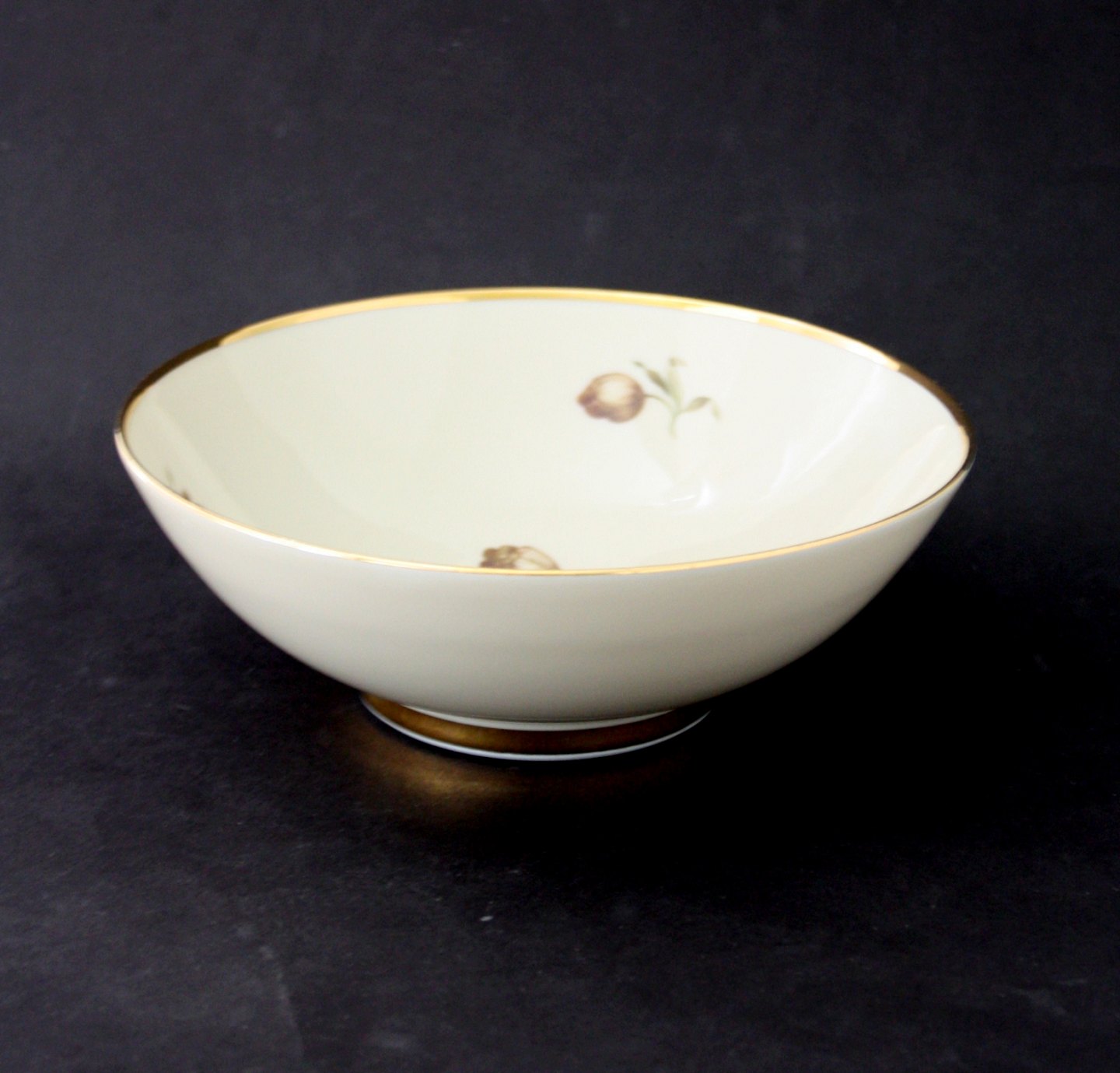 Kjøbenhavns Porcellains Maleri, Rosenborg, Skål på lav fod uden bortekant. Lidt brugsslid på guldkant. Højde 5 cm. Øverste diameter 15 cm. ARKIVFOTO. Pris: 150 kr.