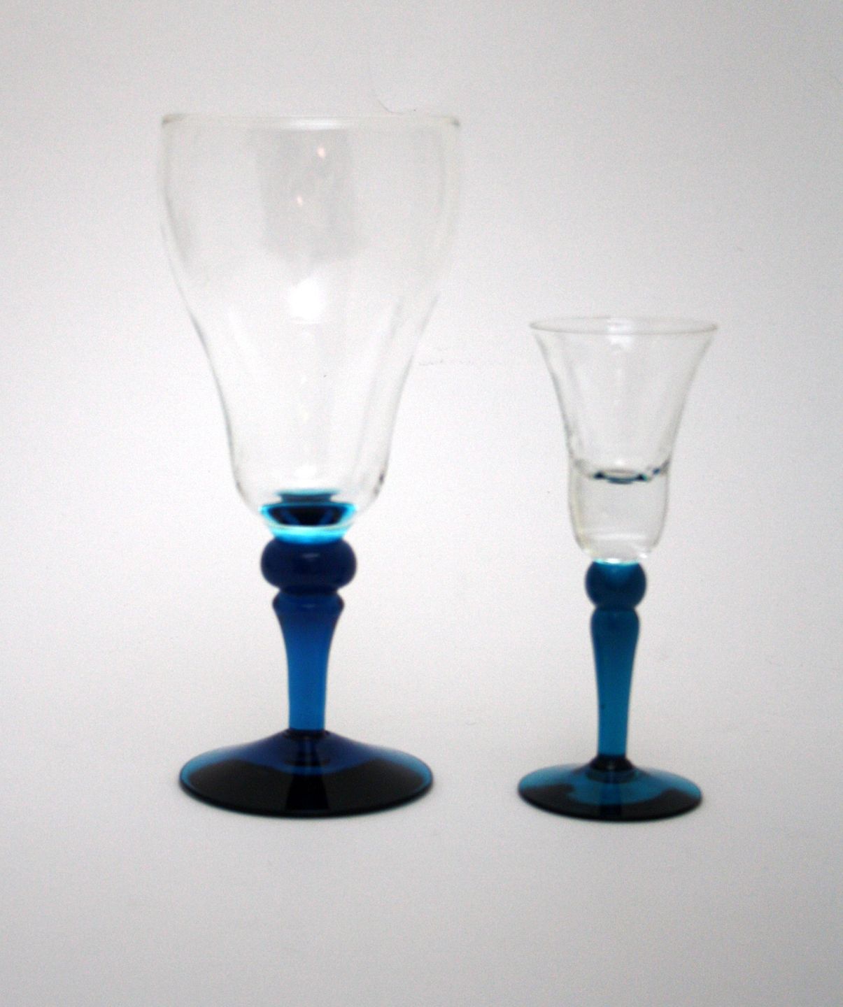 Kastrup Glasværk 1960erne. Hollandske snaps og ølglas med oceanblå stilk og klar kumme. Ølglasset findes ikke i noget katalog, har været en bestillingsvare.Snapseglas, højde 13 cm. Pris: 125 kr. stk. Lager: 4