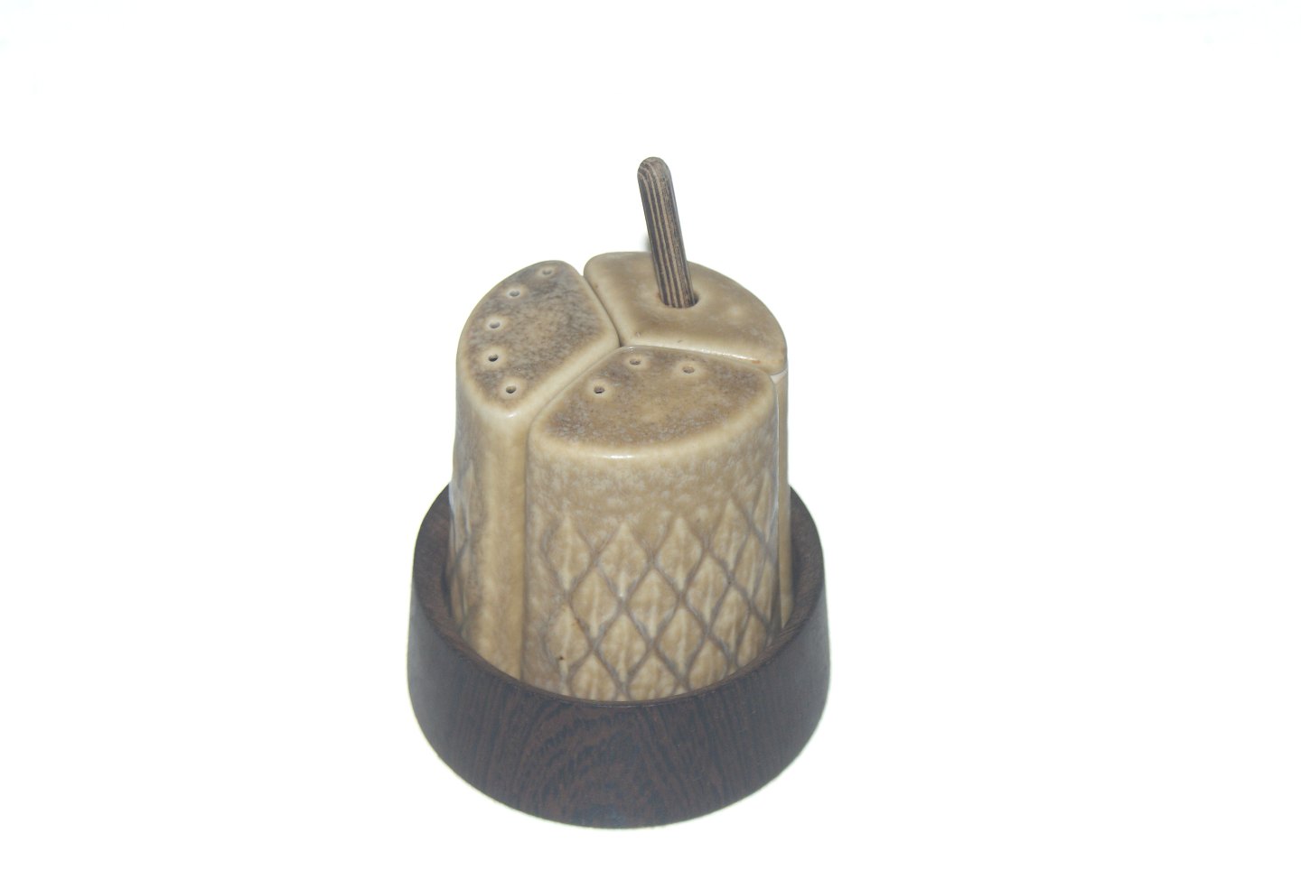 Bing & Grøndahl/Nissen/Kronjyden, Relief stentøj, saltbøsse, peberbøsse og sennepskrukke i træskålDesignet af Jens Harald Quistgaard.
