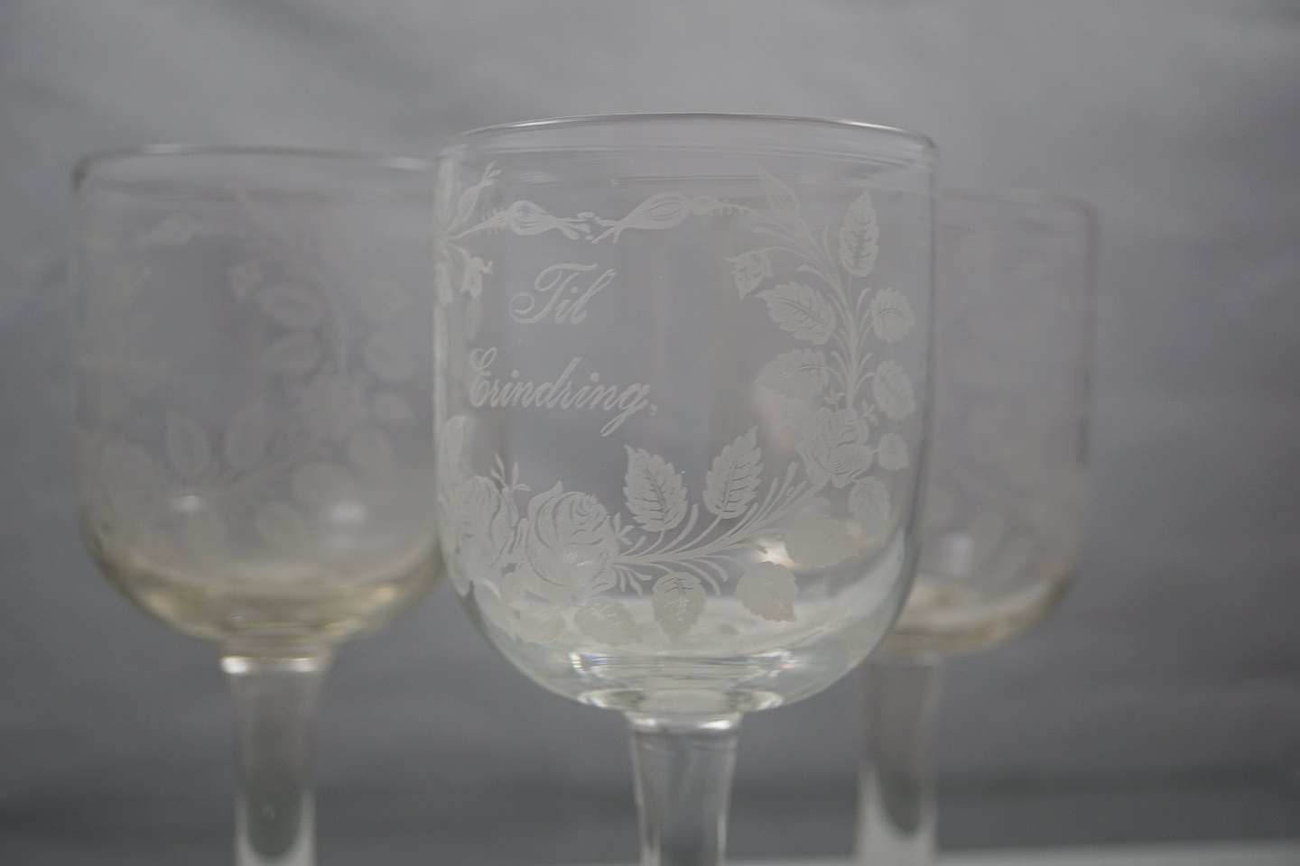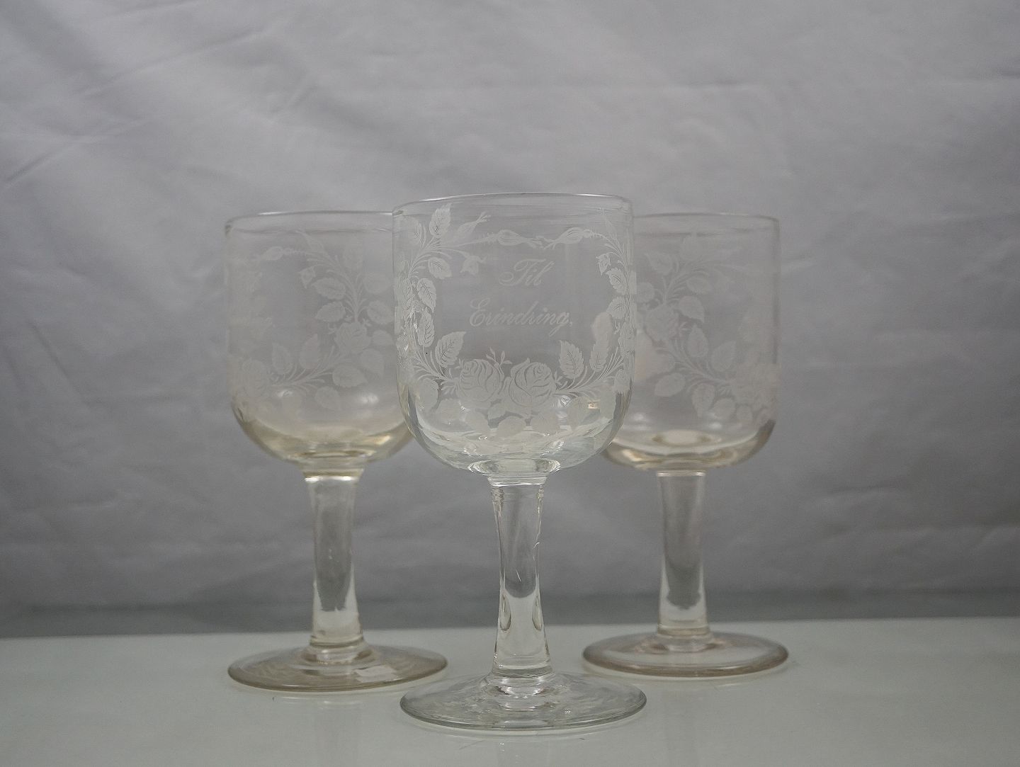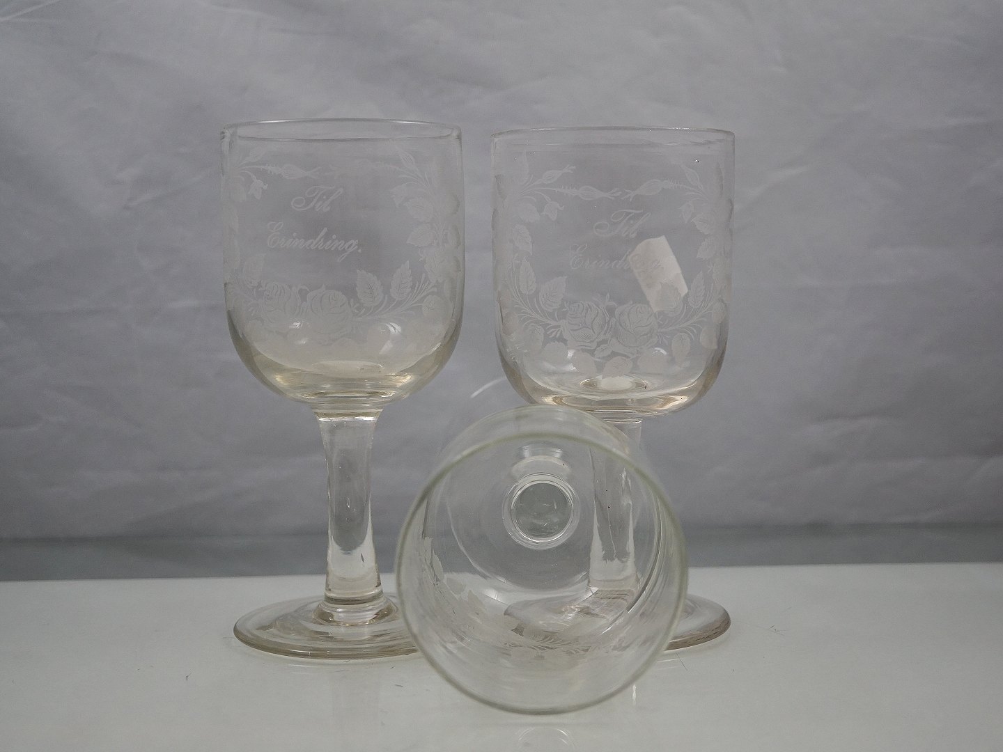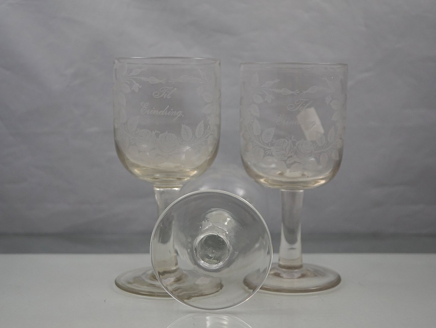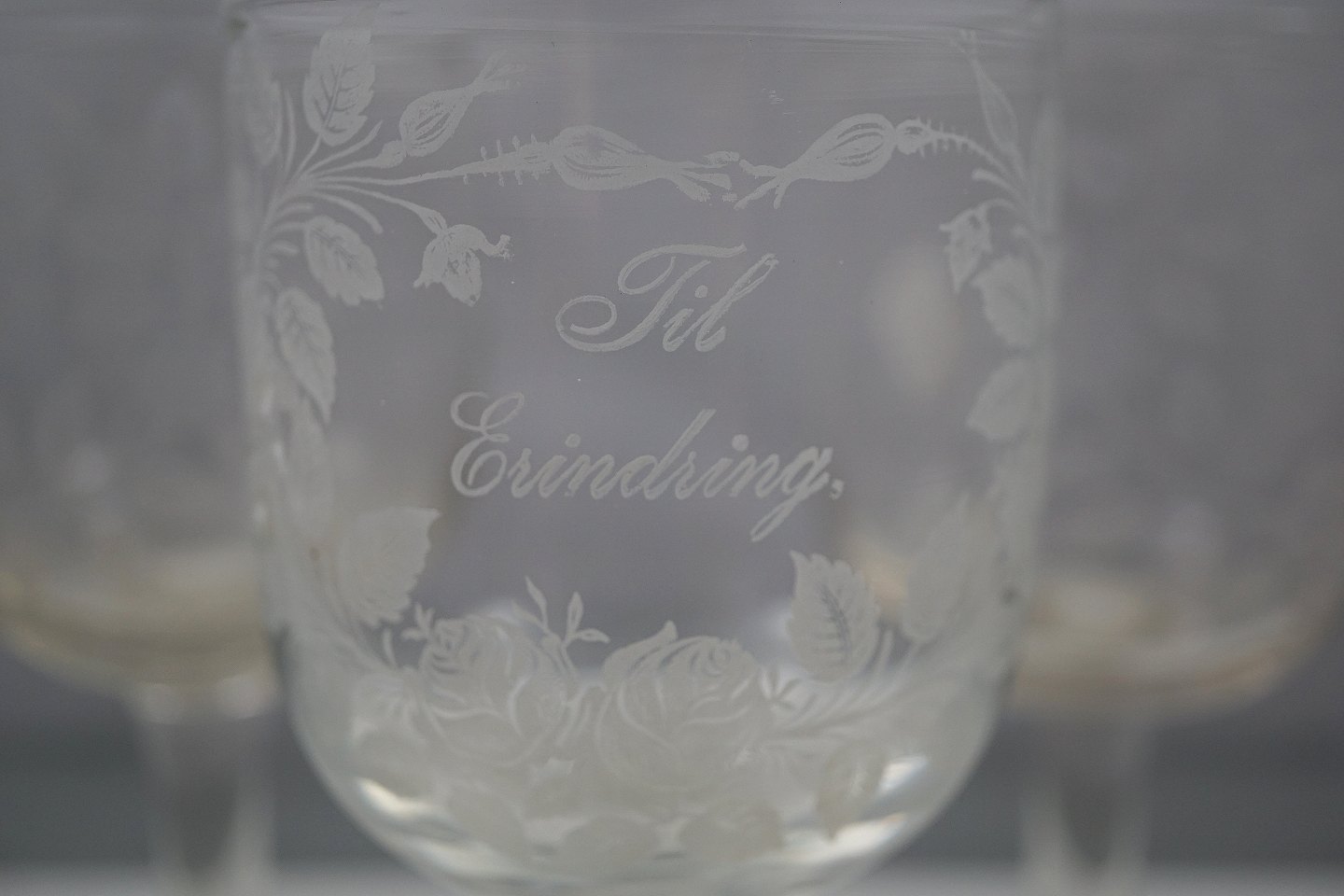 Erindringsglas, klart glas, glat rund stilk med mat ætset blomsterranker og tekst: til erindring.Produceret Kastrup Glasværk