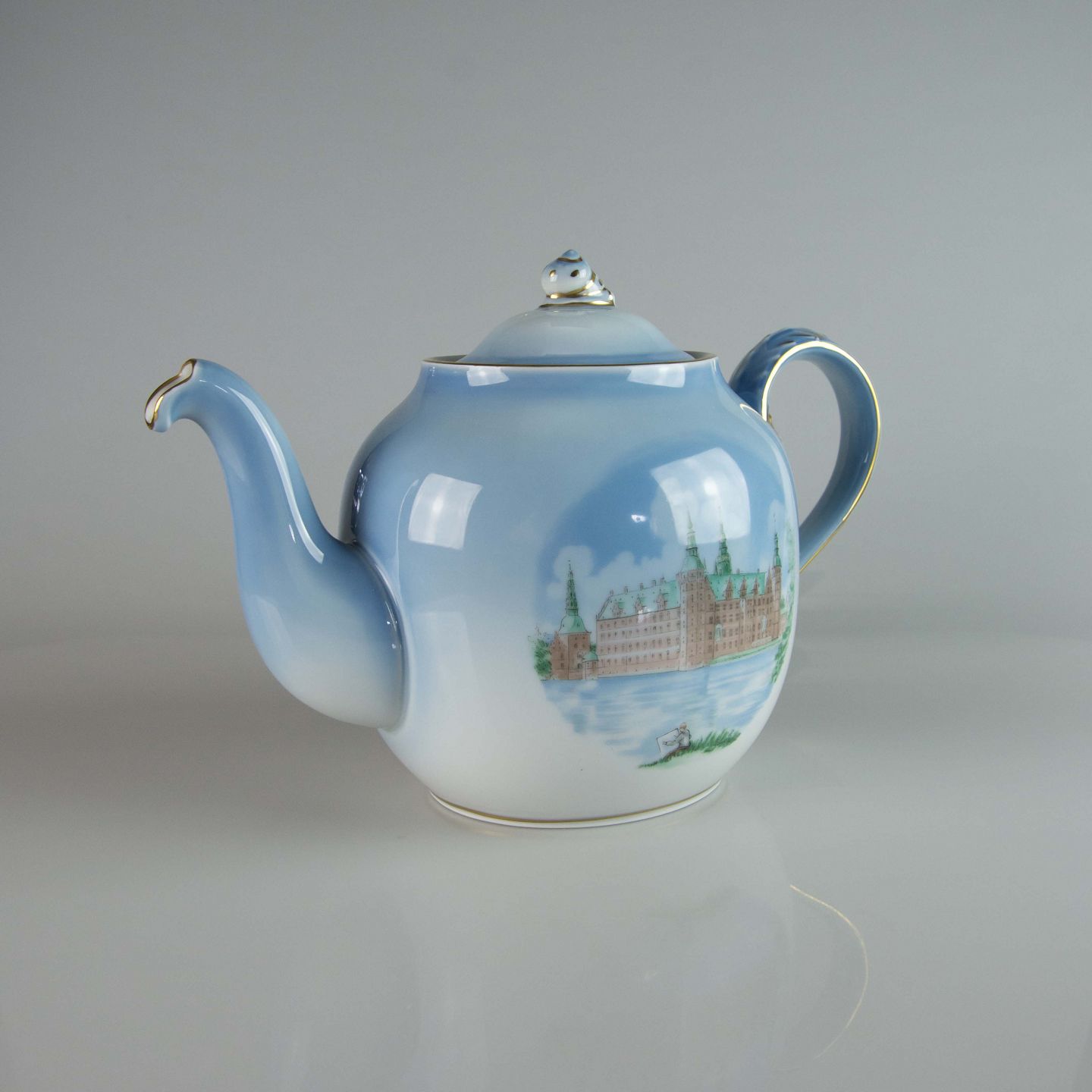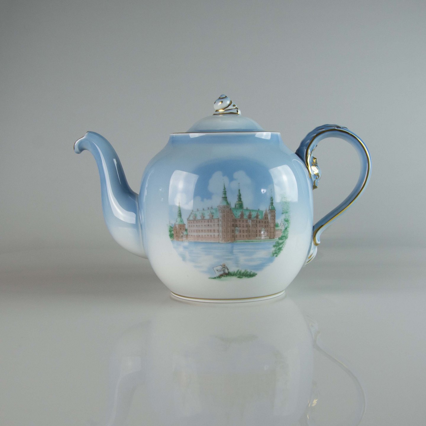 Tekande i porcelæn fra Danmarksstellet med guldkant og motiv af Kronborg. Nr. 656/3562 Producent Bing og Grøndahl