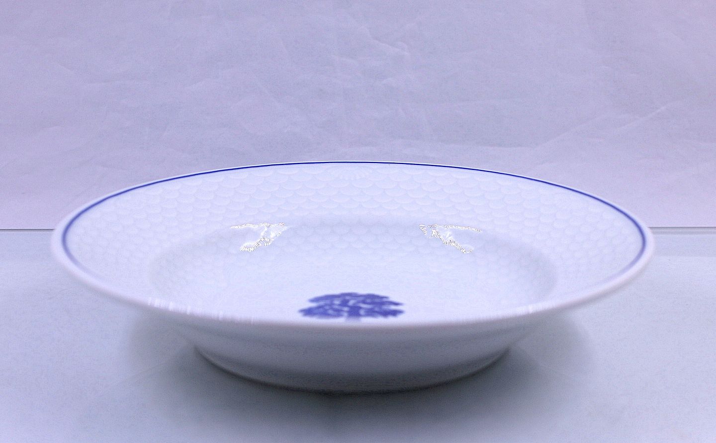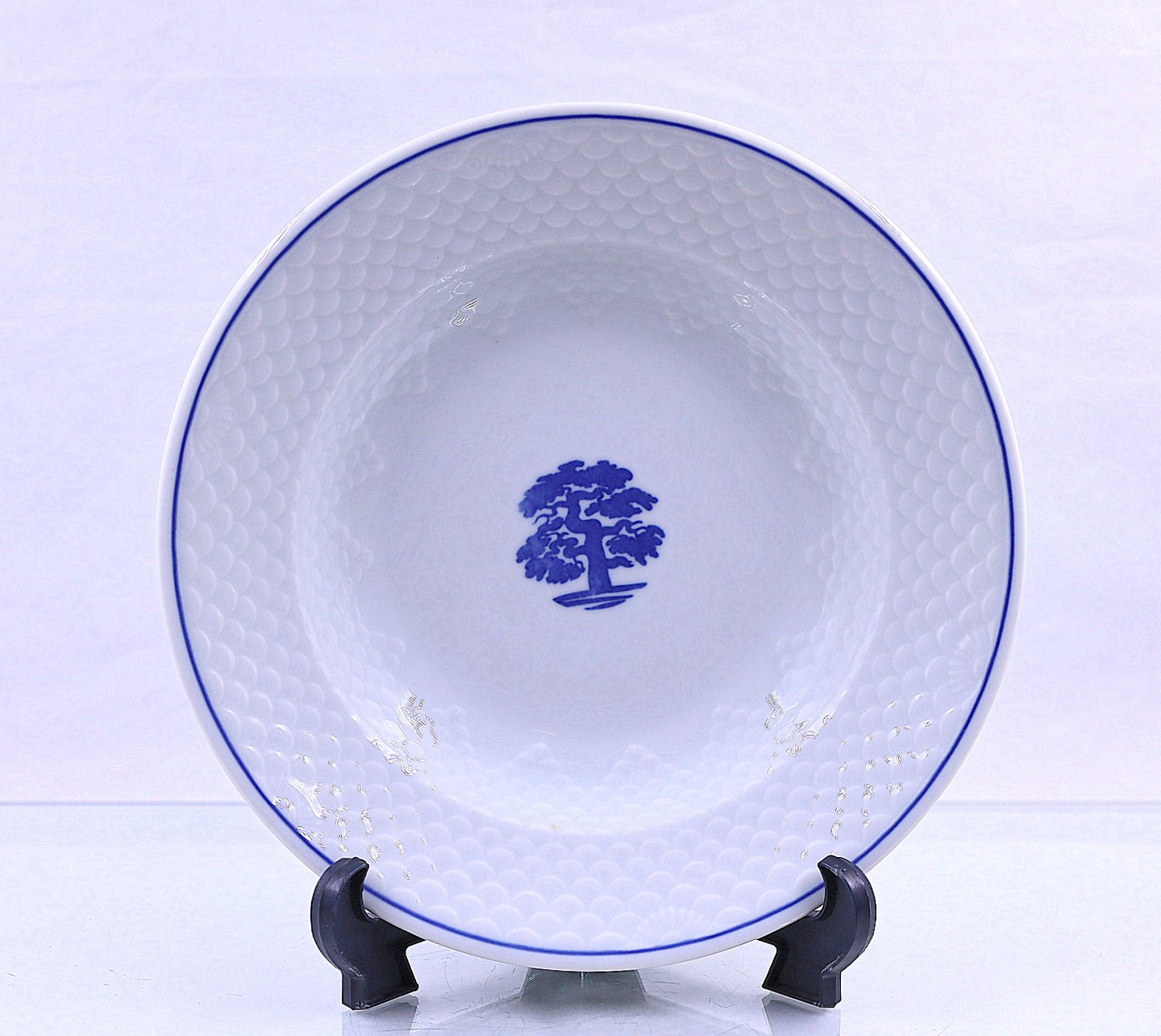 Tallerken i hotelporcelæn fra stellet Egetræ. Nr. 710. Restaurants porcelæn, hvidt porcelæn med stiliseret, blåt, egetræ som dekoration.