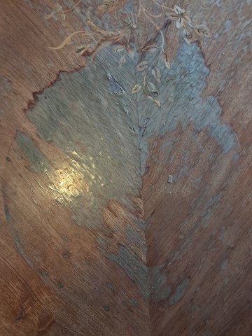 Sofabord i fineret og lakeret mahogni med intarsia af rosentræ fra 1980erne.Bordpladen har finer defekter..