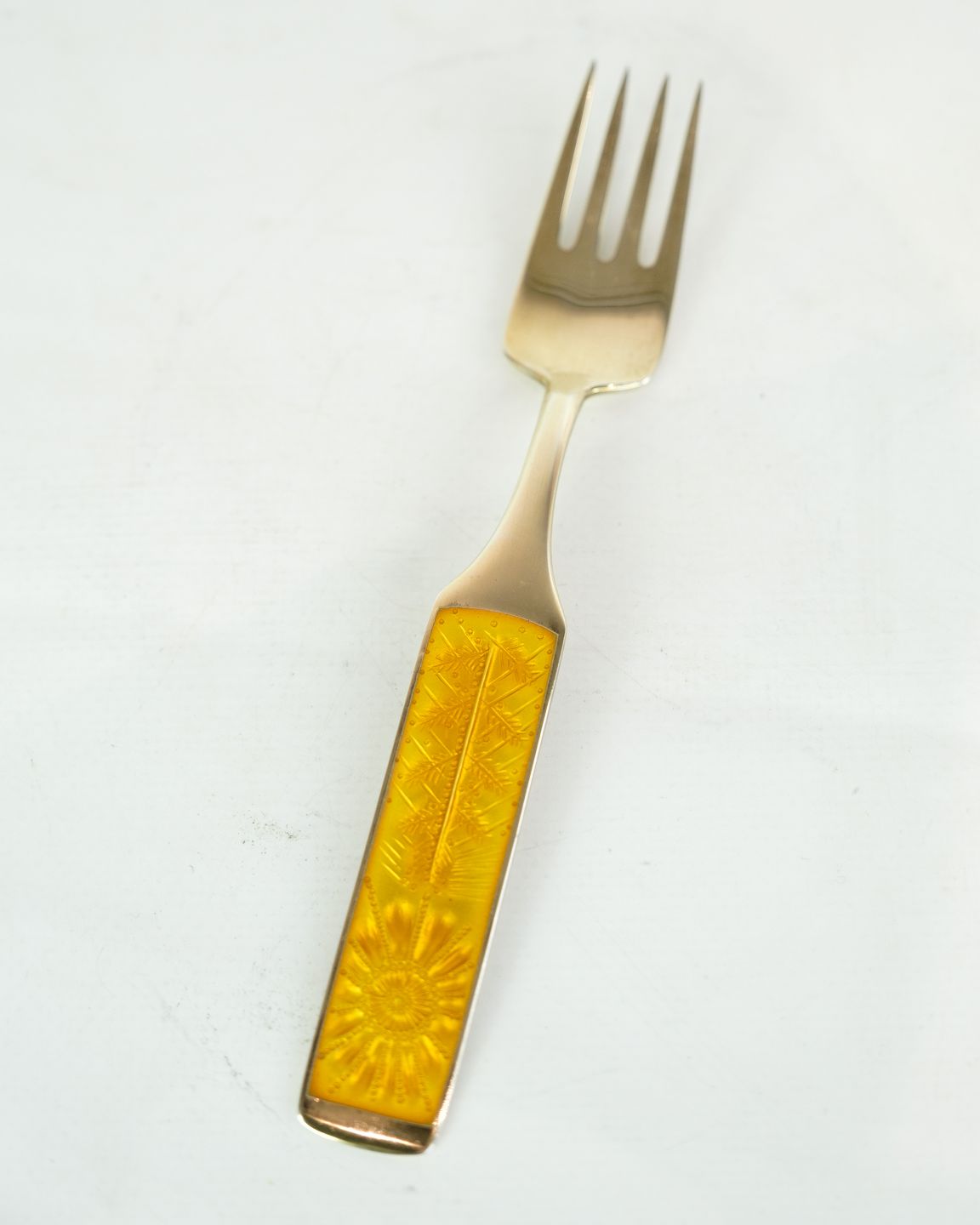 Anton Michelsen forgyldt sterlingsølv juleske fra 1967 er en smuk og eksklusiv juleske designet af den berømte guldsmed Paul Rene Gaugain. Skeen er fremstillet af højkvalitets sterlingsølv, der er forgyldt med guld for at give den en glitrende og luksuriøs finish. Motivet på skeen er Juleglansen, der er en symbolsk repræsentation af julens magi og glæde. Det fine og detaljerede håndværk gør denne juleske til et værdifuldt samlerobjekt og en perfekt gaveidé til en elsket person i dit liv.Vi har 2 skeer og 3 gafler