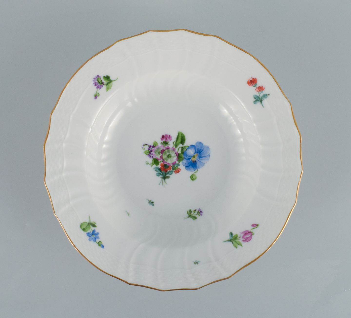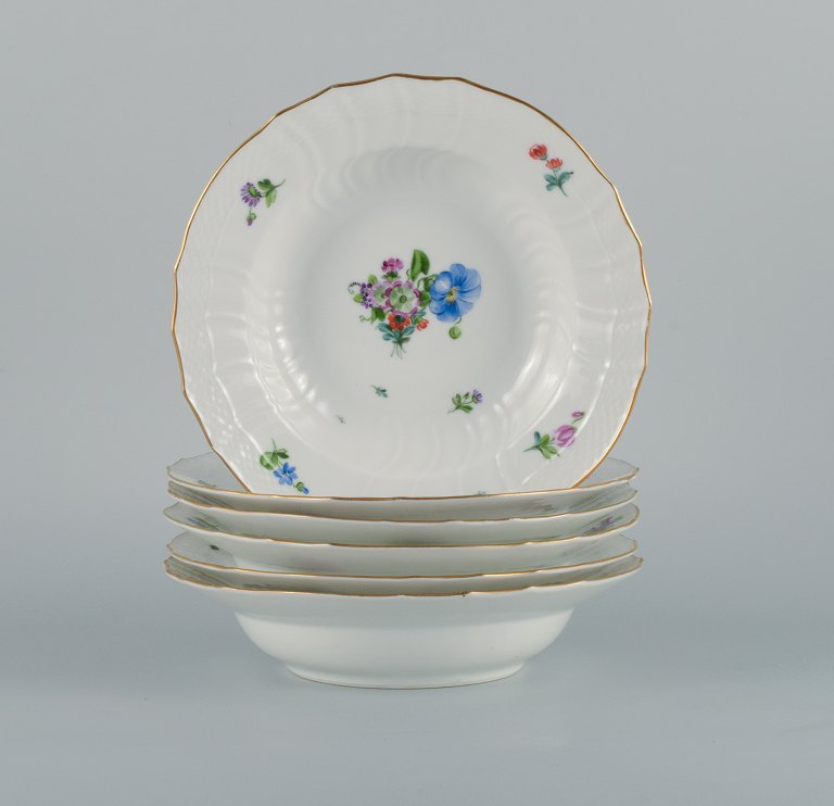 Royal Copenhagen Saksisk Blomst. Seks dybe tallerkener i håndmalet porcelæn med blomster og gulddekoration.Modelnummer 493/xxxx.