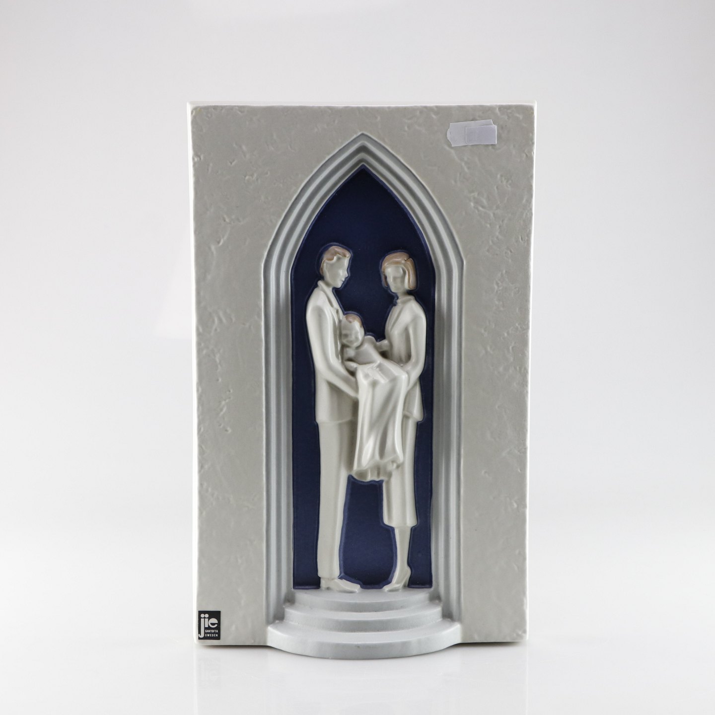 Relief i keramik med motiv af par med barn i dåbskjoleDesign Eva Jarenskog