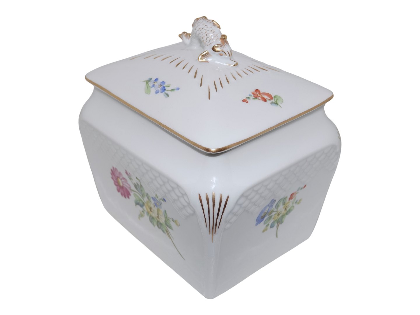 Bing & Grøndahl Saksisk Blomst på hvidt porcelæn, kiksespand.Dekorationsnummer 77.