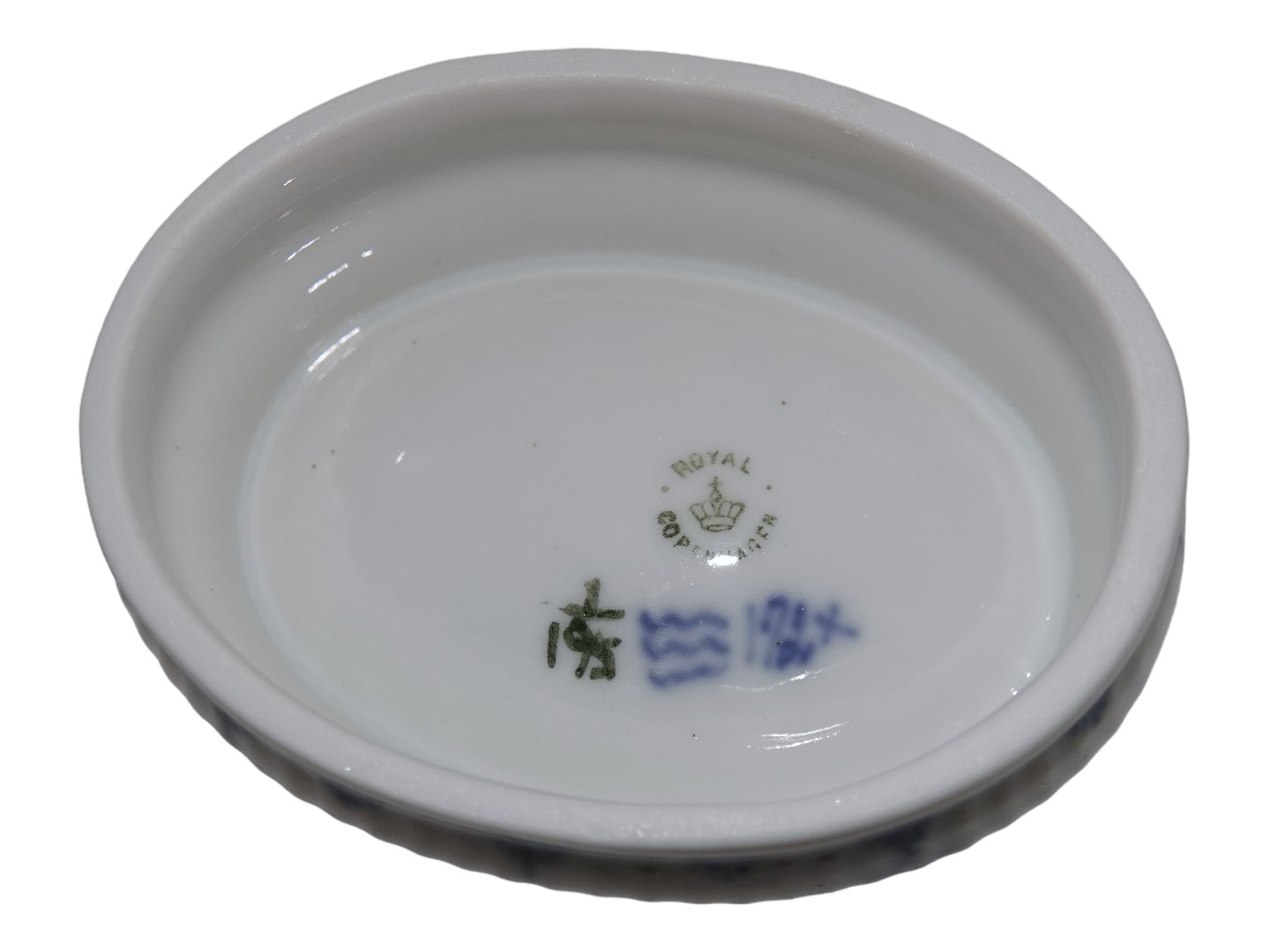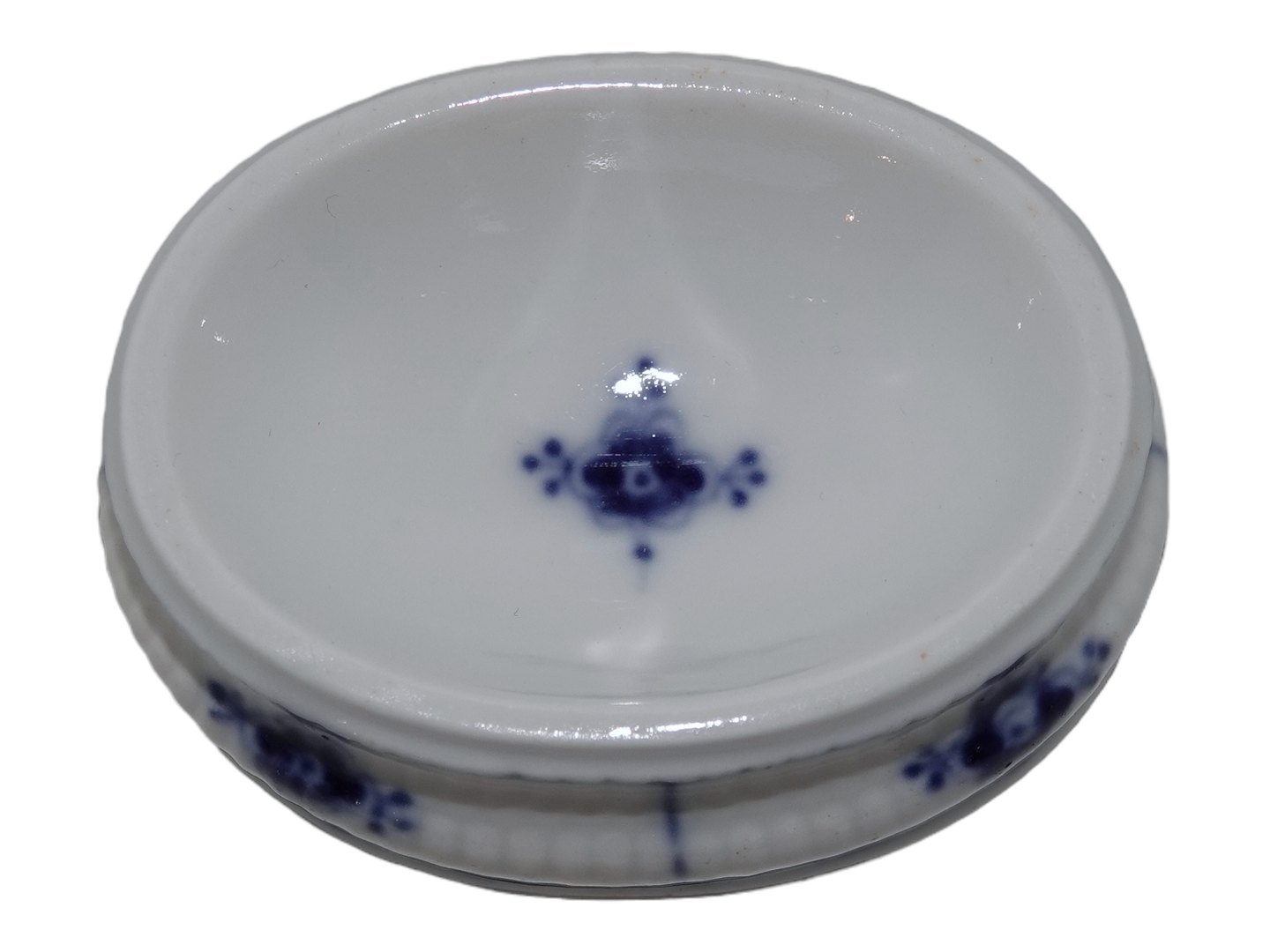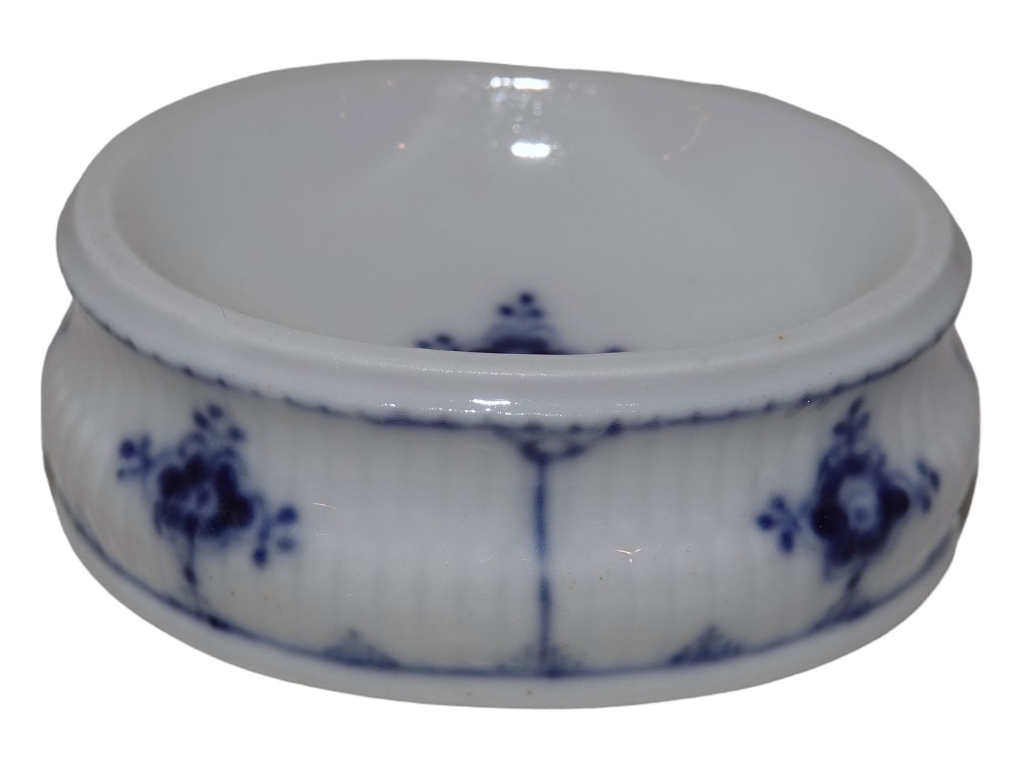 Royal Copenhagen Musselmalet Riflet, ovalt saltkar.Af fabriksmærket ses det, at denne er produceret mellem 1898 og 1923.