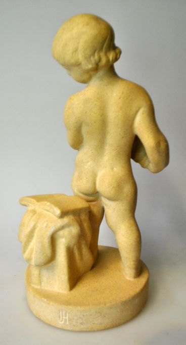 Dänischer Künstler (20. Jahrhundert): Ein Junge mit Akkordeon und Noten. Künstlicher Stein. Signiert: Monogramm. Höhe: 29 cm. Vermutlich Holger Jensen.Bestellnummer: 25467