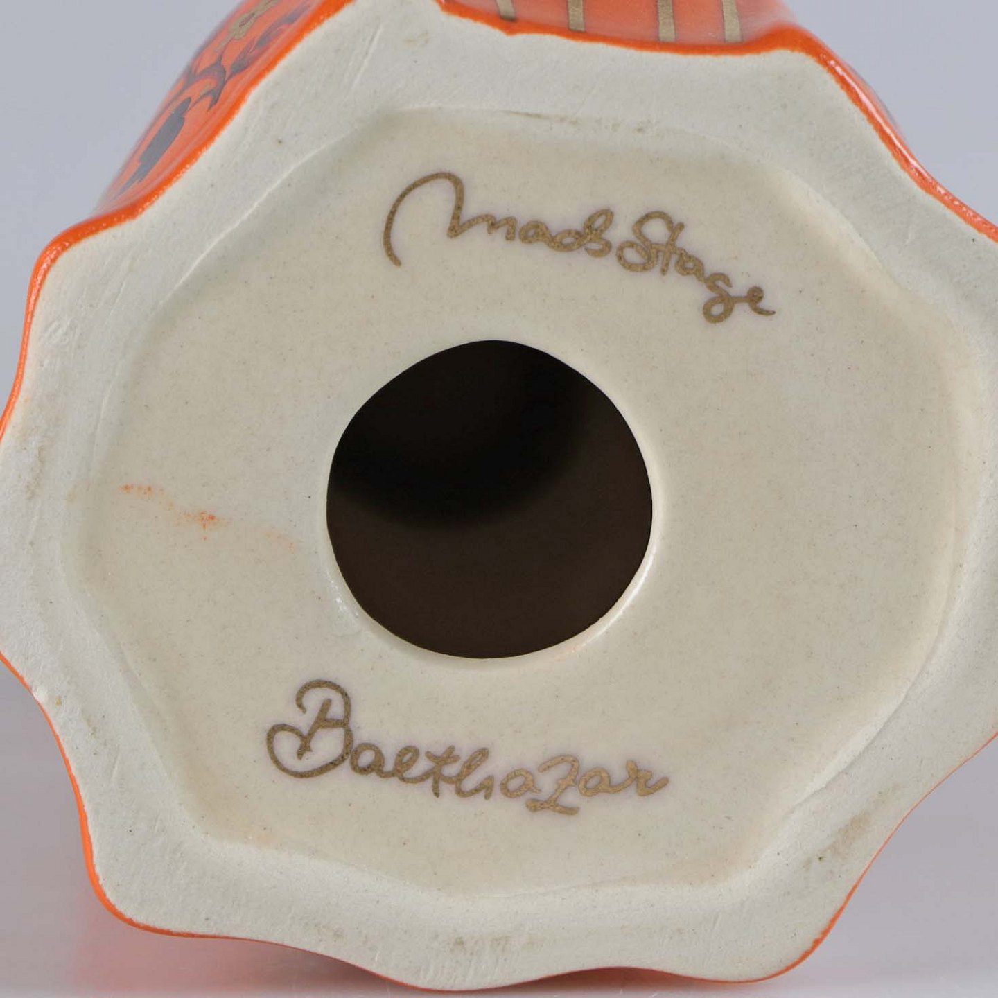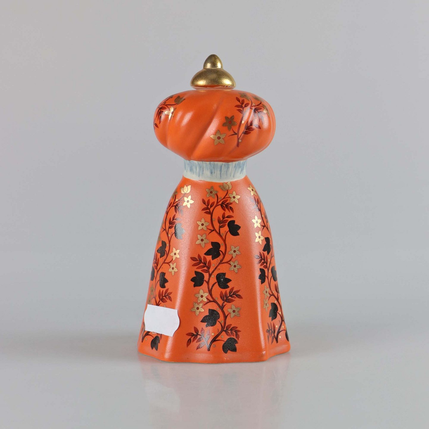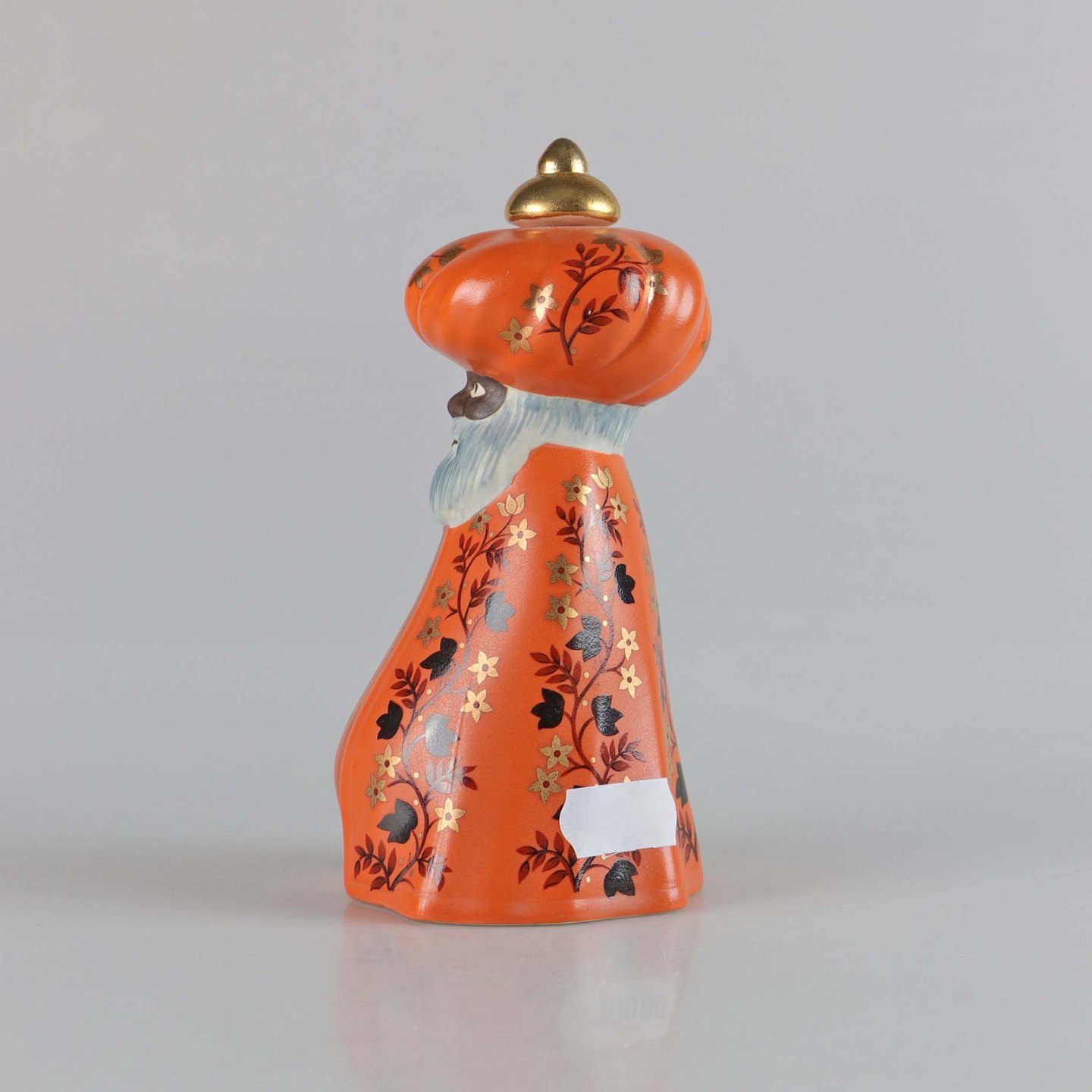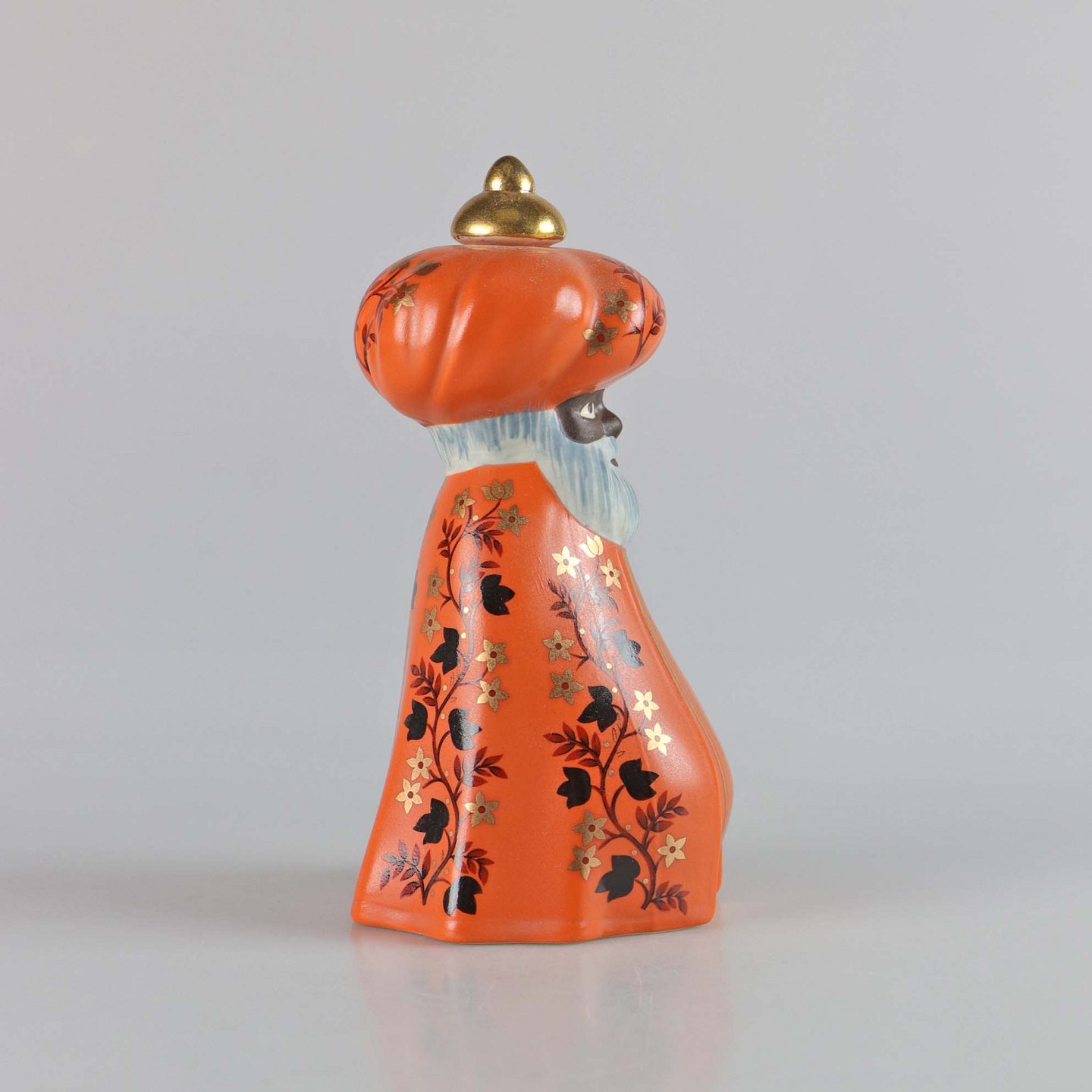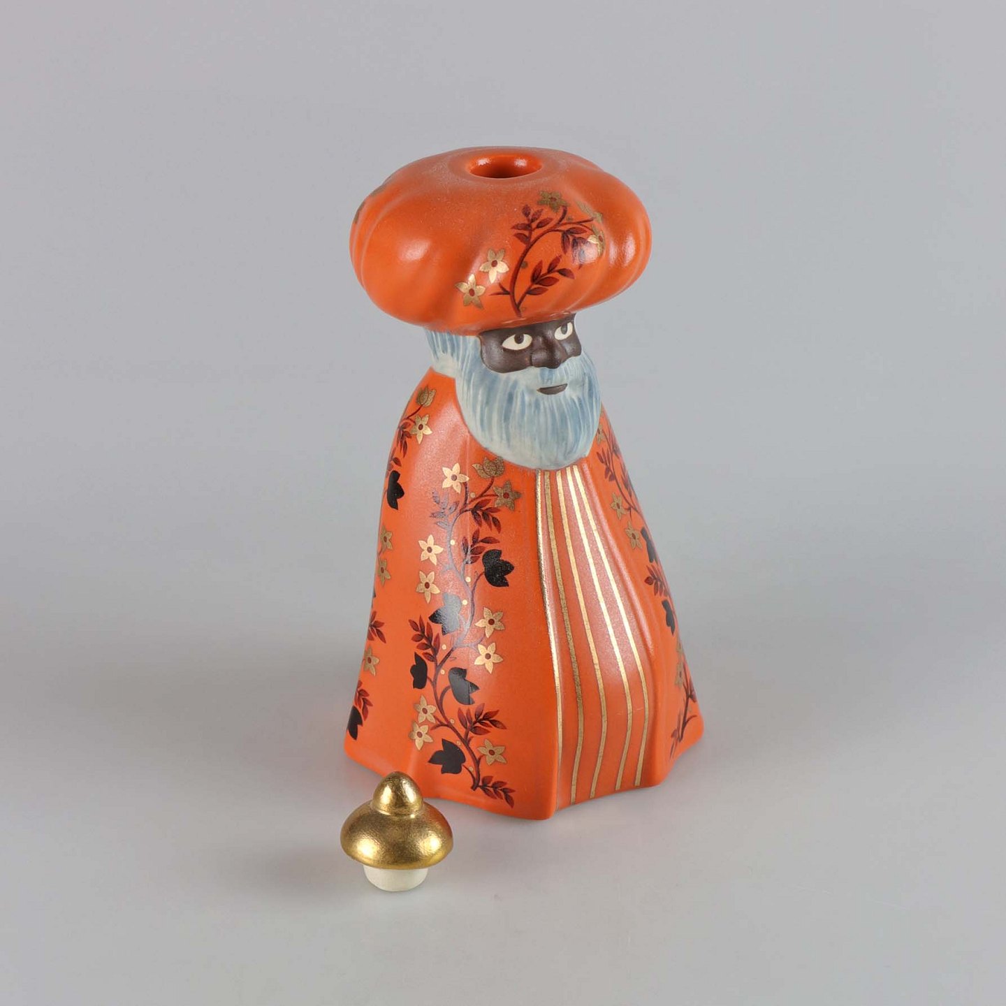 Figur i porcelæn. Balthasar fra De tre vise mænd. Når guldknoppen tages af, er der hul til et kerte lys. De hellige tre kongerProducent Mads Stage