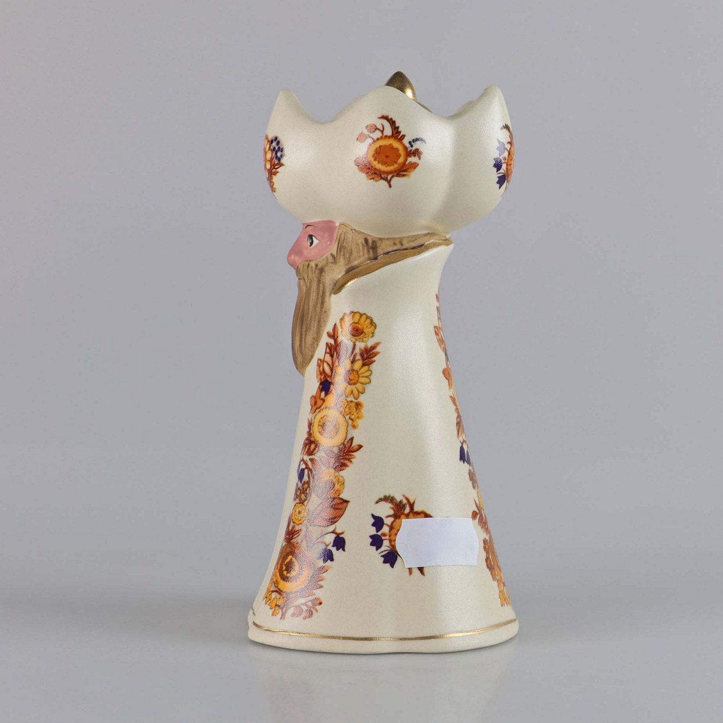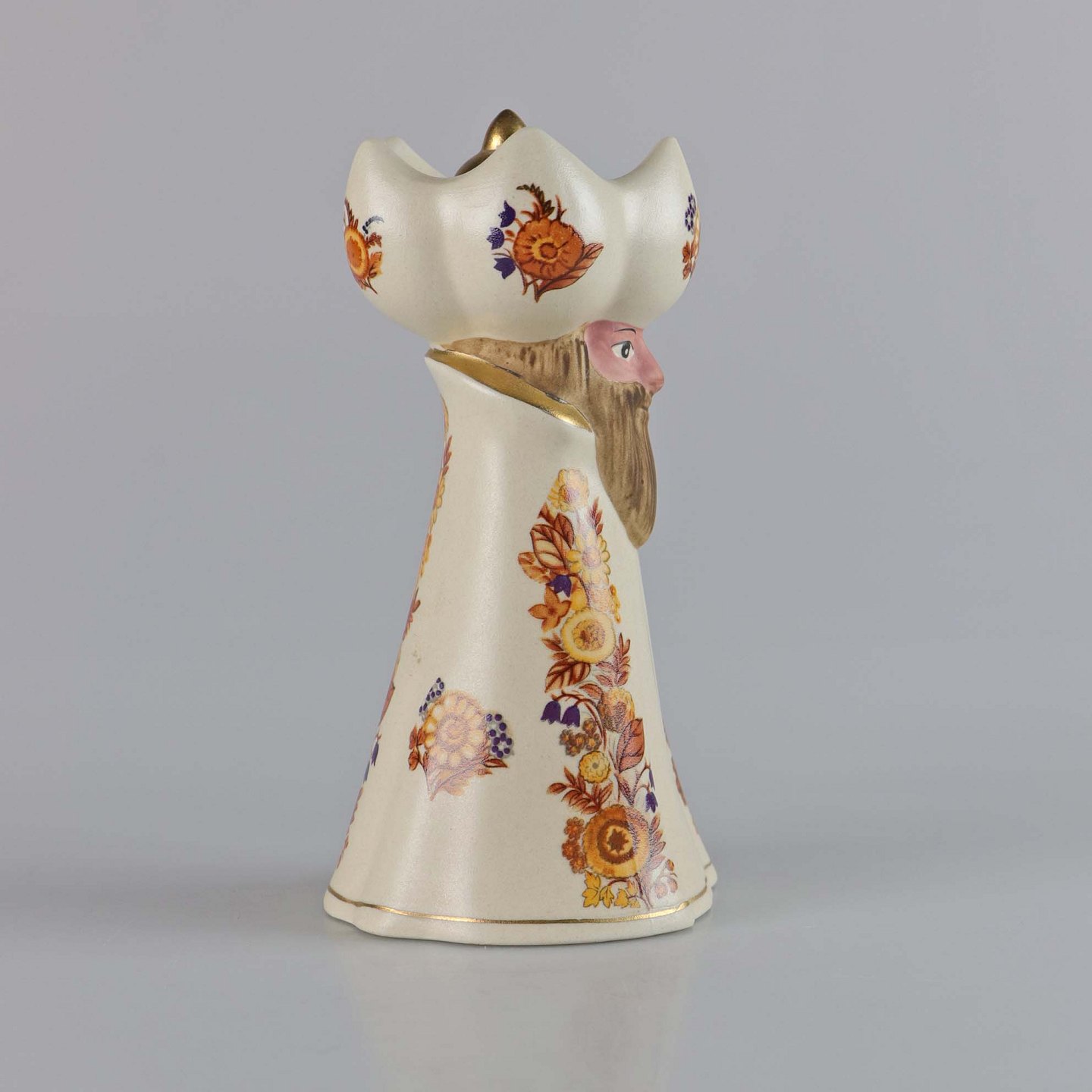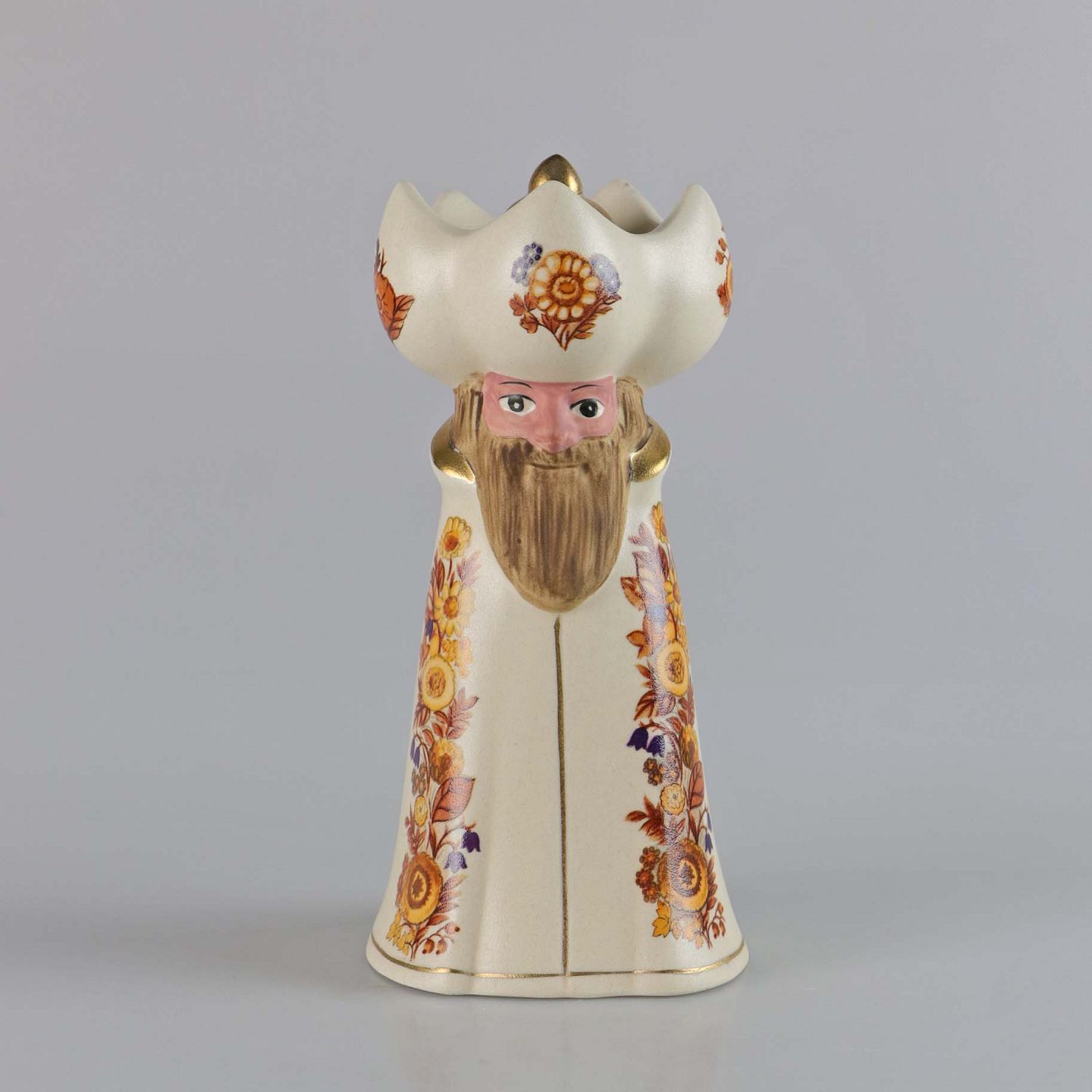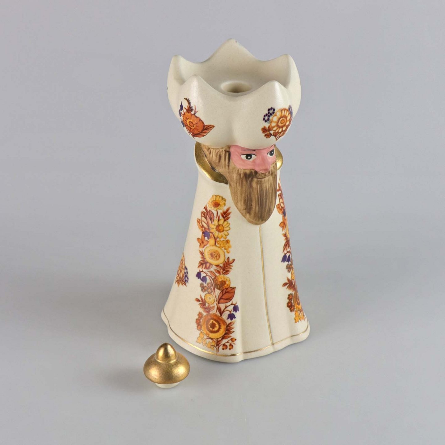 Figur i porcelæn. Kaspar fra De tre vise mænd. Når guldknoppen tages af, er der hul til et kerte lys. En af de hellige tre kongerProducent Mads Stage