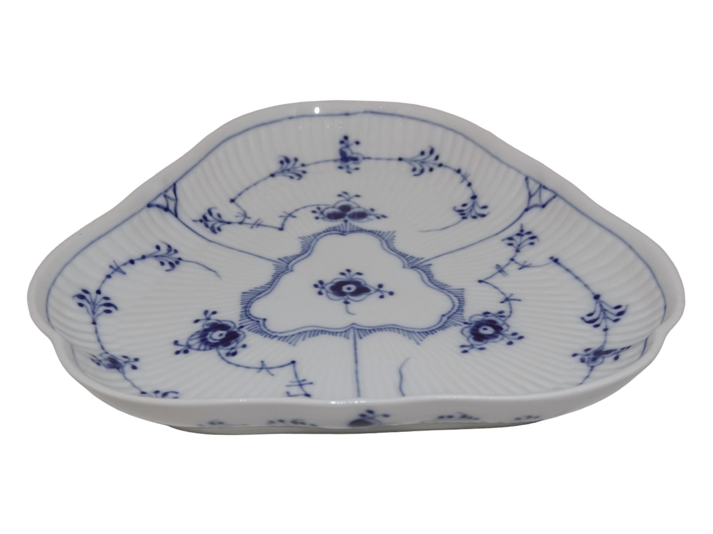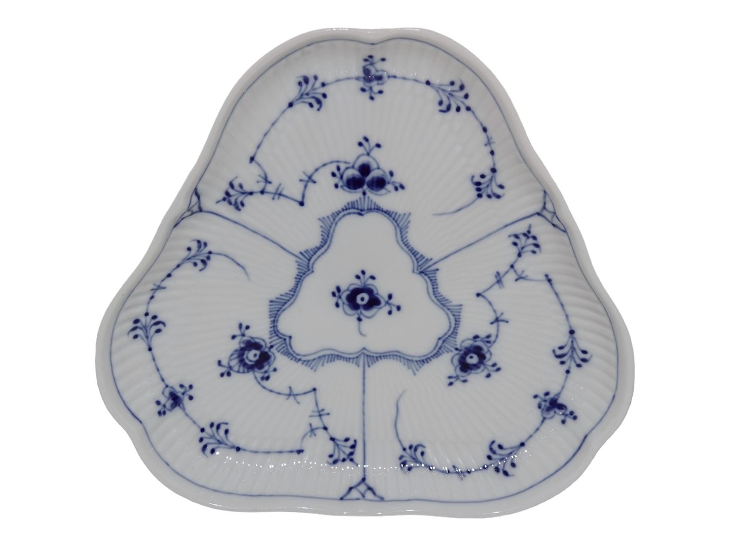 Royal Copenhagen Musselmalet Riflet, trekantet fad.Af fabriksmærket kan det udledes, at denne er produceret i mellem 1975 og 1979.