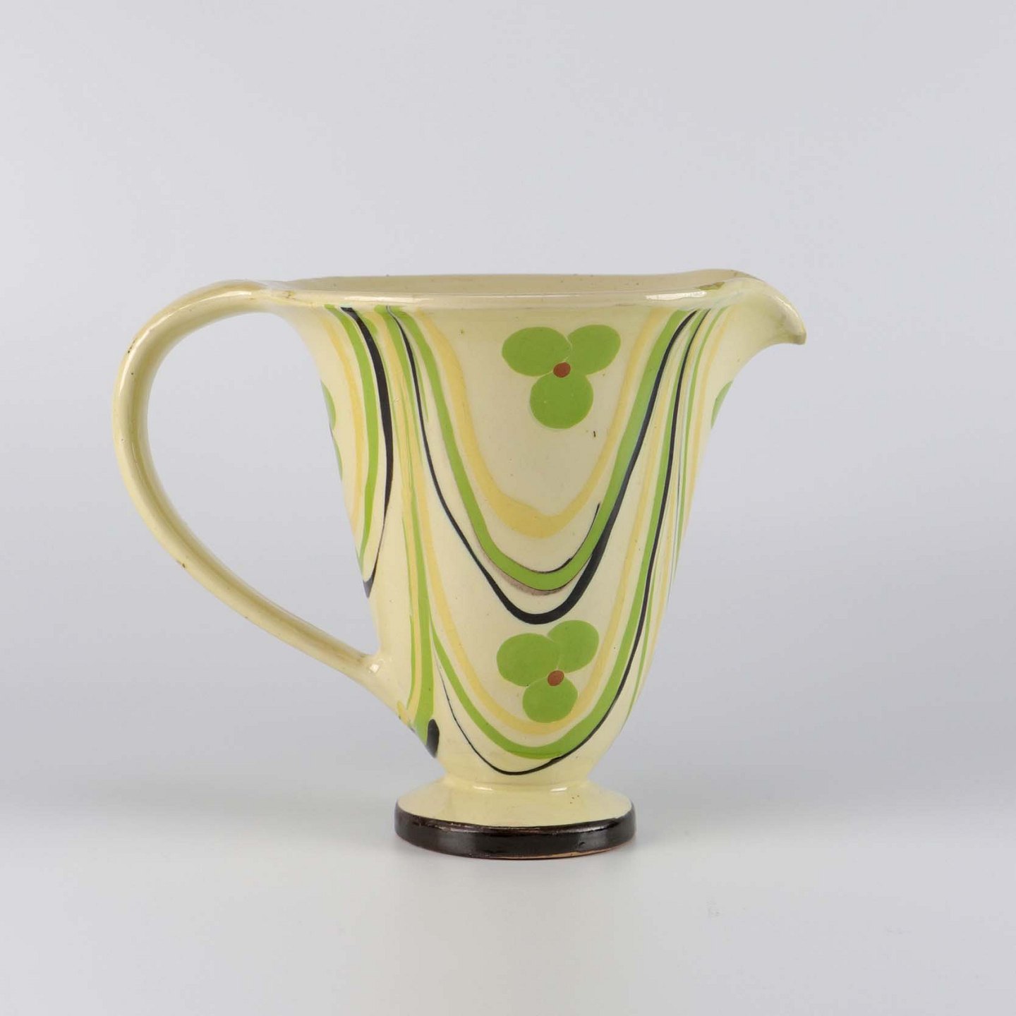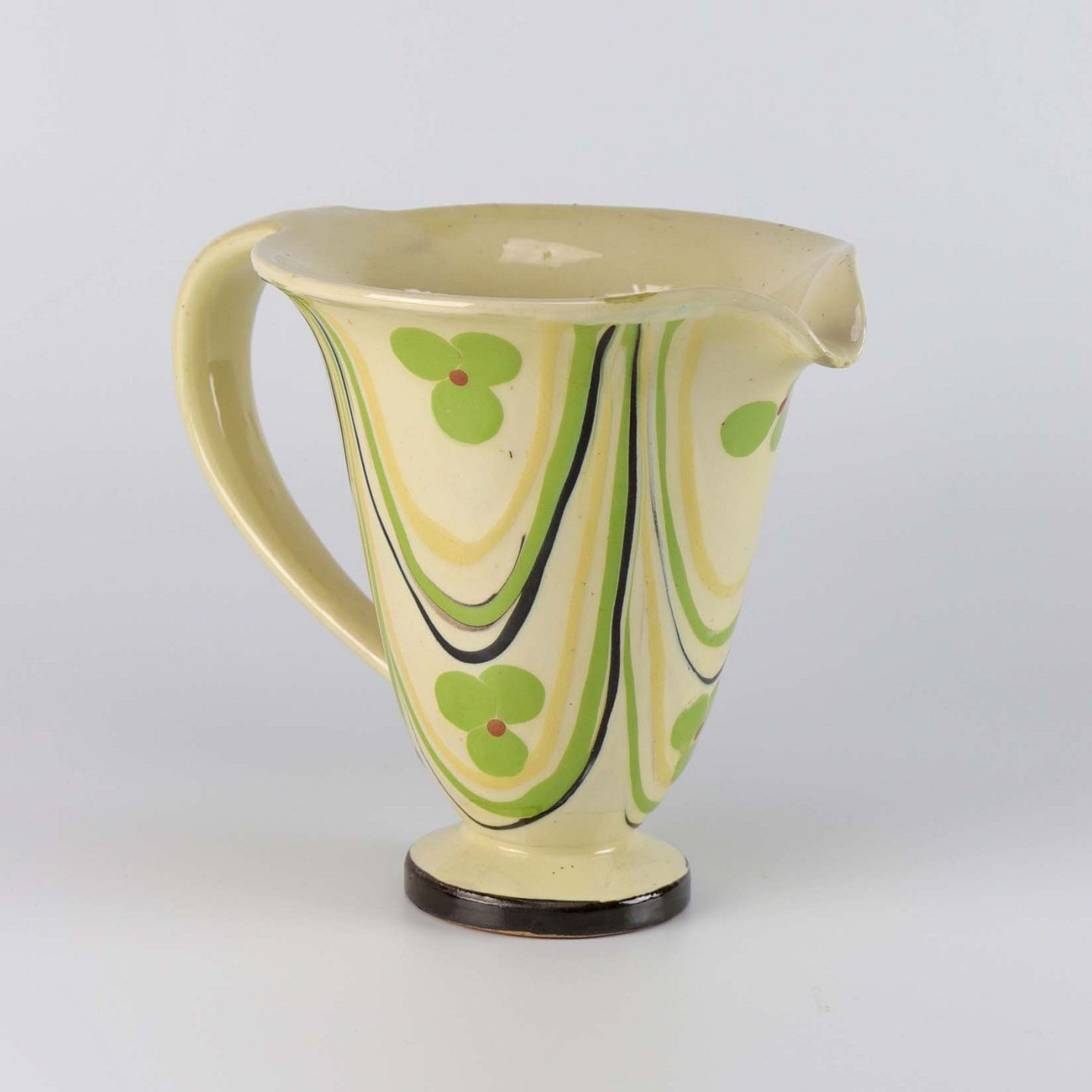Kande af keramik i beige med mønstre i gul og grønne farverProducent Herman A. Kählers værksted
