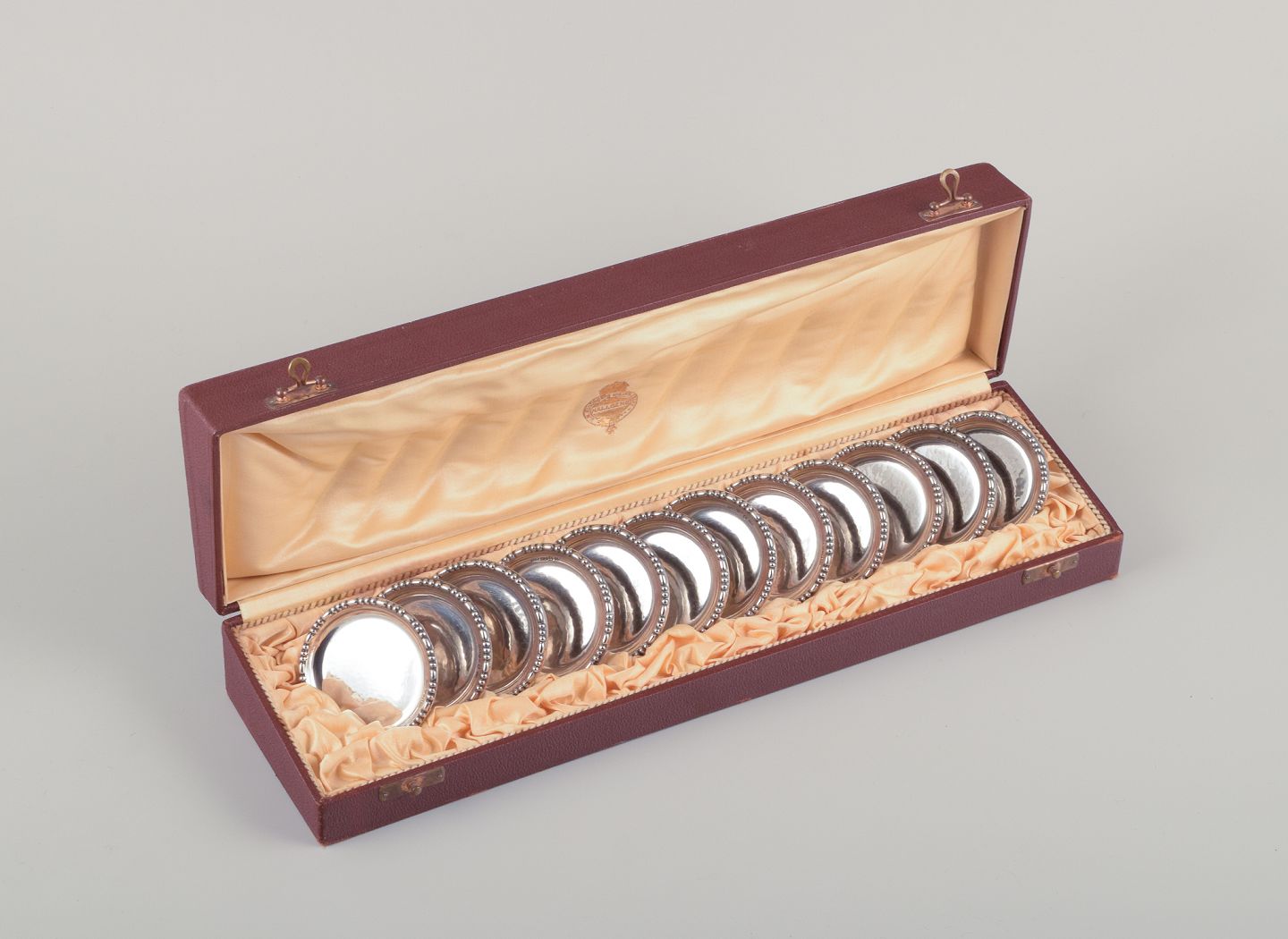 Hallberg, Stockholm, Royal Swedish Court Supplier. A set of twelve glass coasters in 830 silver. Art Deco.Date stamp A8 = 1927.