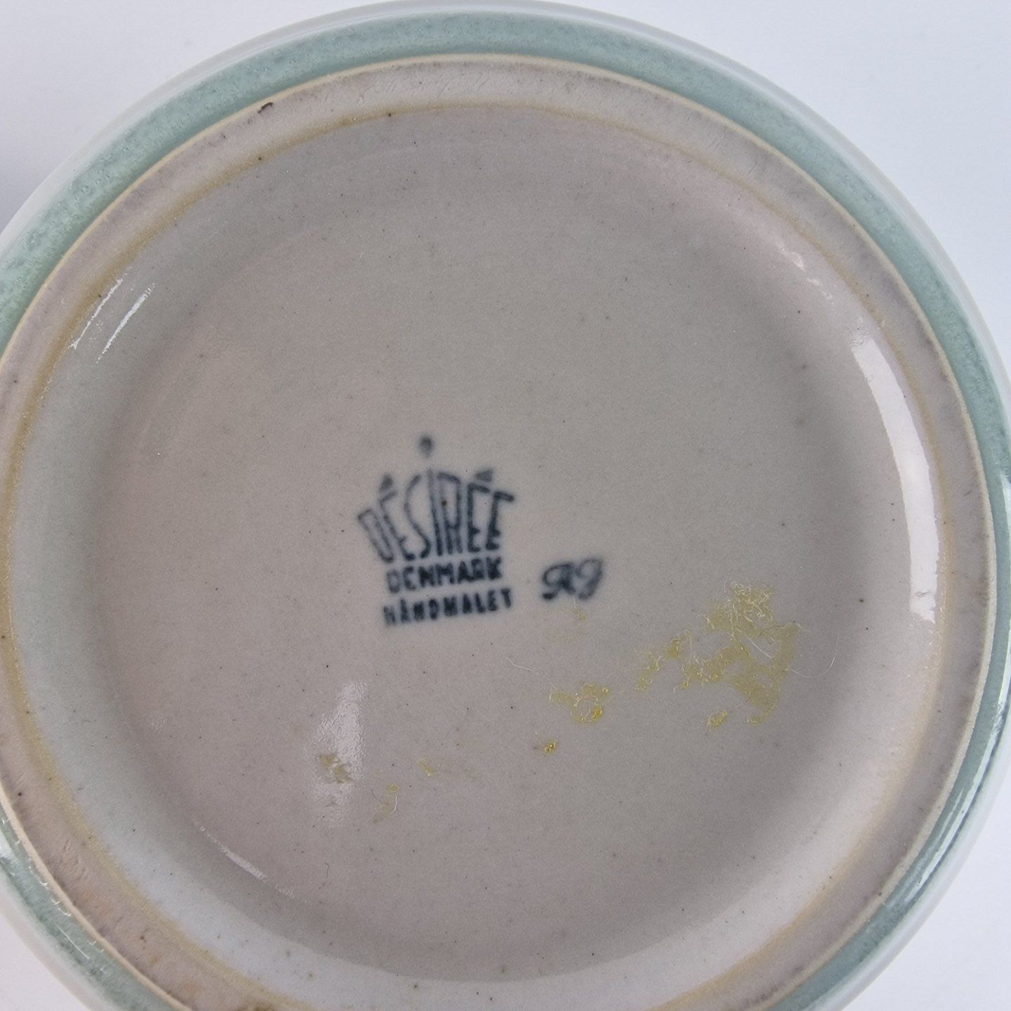 Diskos er af ovnfast stentøj. Stellet er gråt og håndmalet med brune og grønlige detaljer