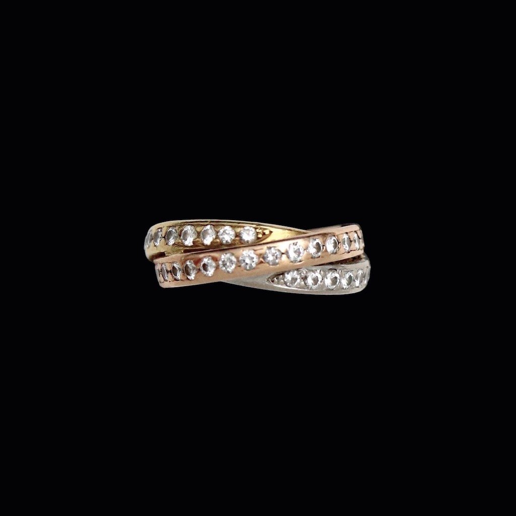 Stenstrup juveler - Copenhagen. Triple diamantring i 18k guld, hvidguld og rosaguld med talrige diamanter på hver 0.03ct.Tegnet og udført hos Stenstrup juveler, Copenhagen.