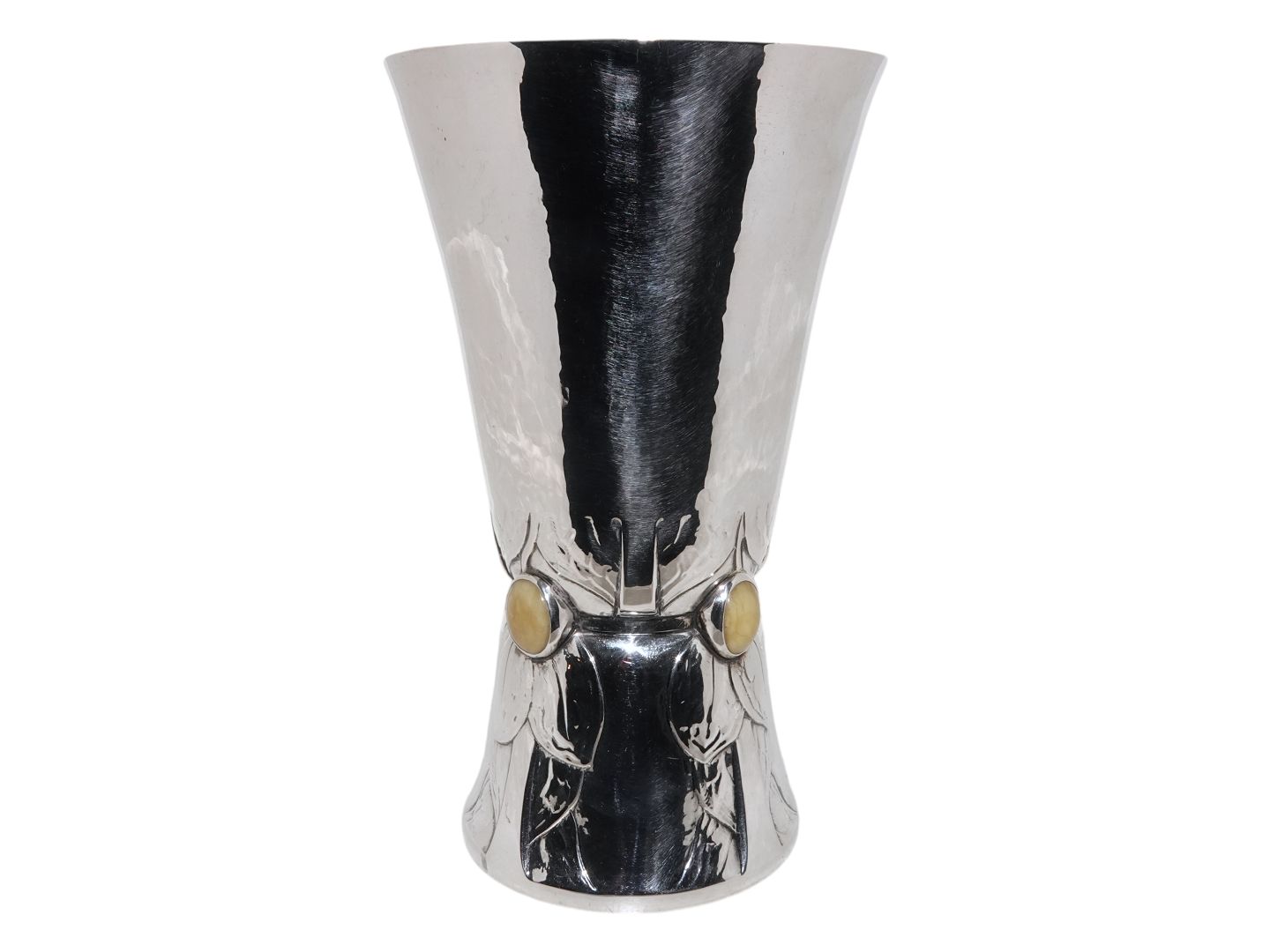 Georg Jensen silver, large and very early vase with four pieces of milk amber.This was produced between 1901 and 1908 and is a very early piece.