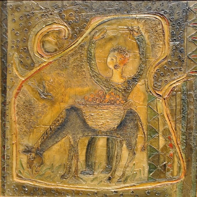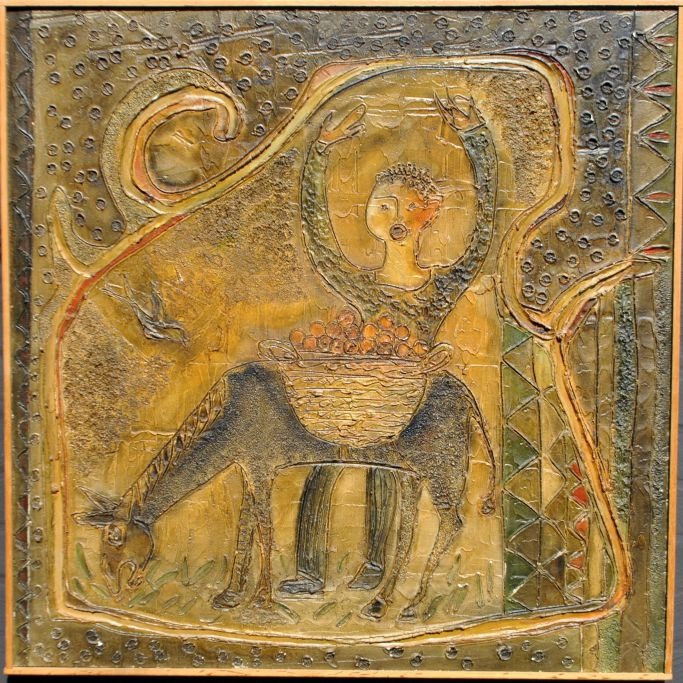 Lem, Kaare (1944 - 2013) Dänemark: Mann mit Esel. Bemalter Gips. H: 83 cm. B: 83 cm.Verso beschriftet.