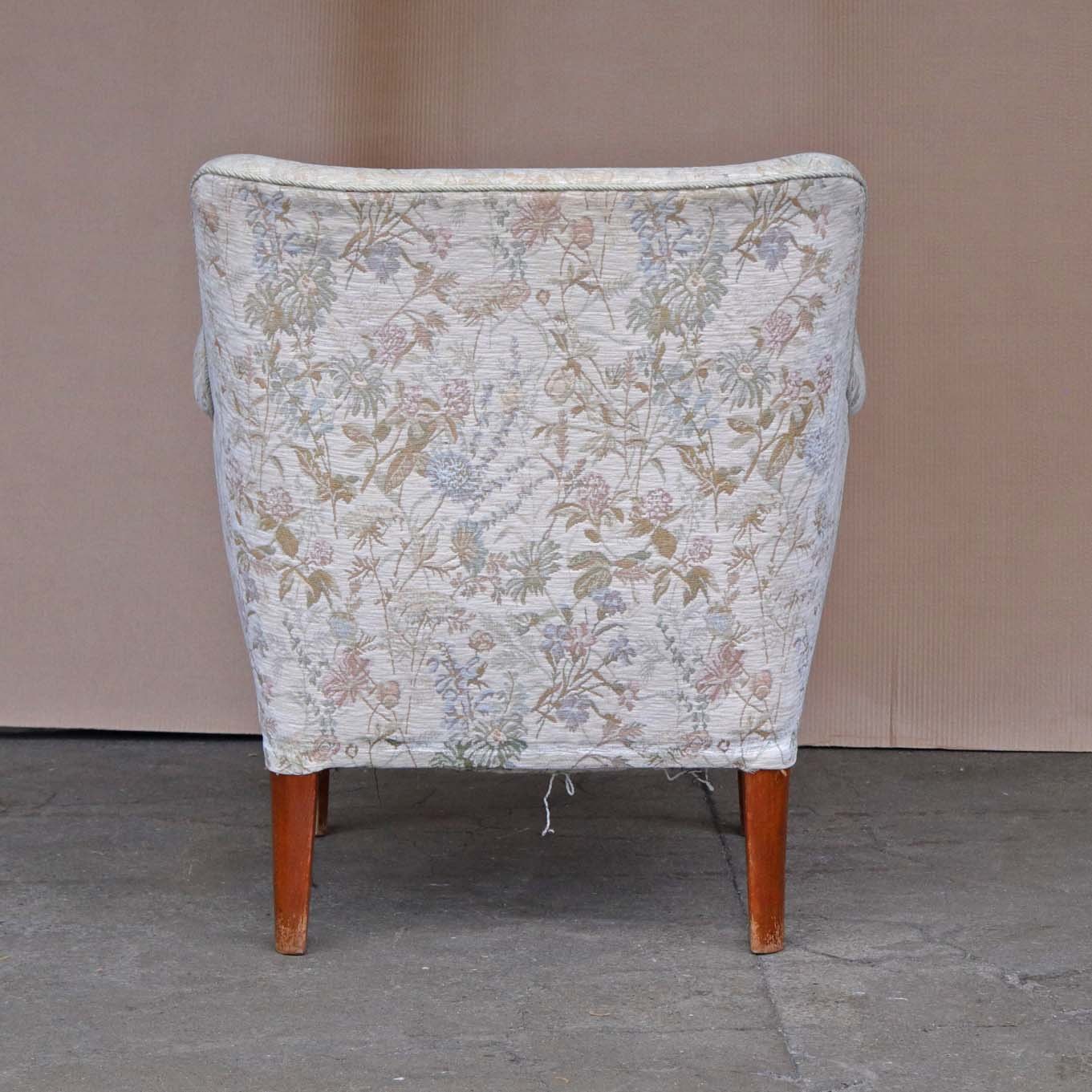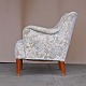 Lænestol med stel i lakeret træ. Stolen er betrukket med lyst struktureret stof med blomstermønster og har sæde med springfjederDesign: Hvidt og Mølgaard