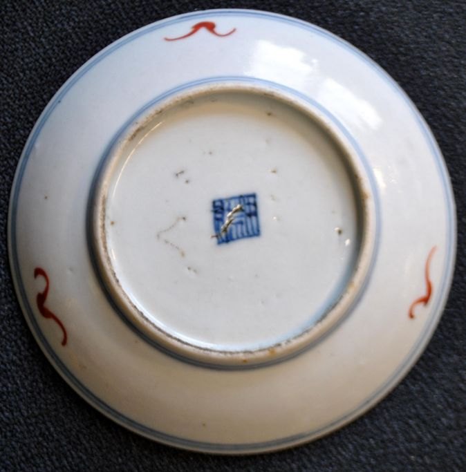 Chinesischer Porzellanteller, polychron dekoriert, Motiv aus dem 19. Jahrhundert mit Blumen und Schrift. Unterzeichnet. Durchmesser: 12 cm.Bestellnummer: 27181
