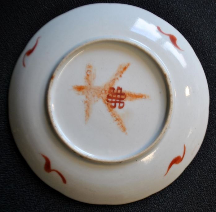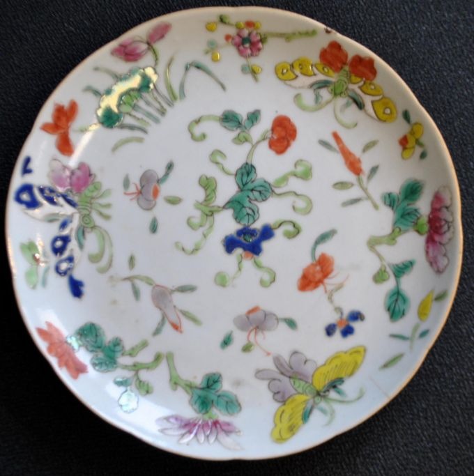 Chinesischer Porzellanteller, polychron dekoriert, Motiv aus dem 19. Jahrhundert mit Schmetterlingen und Blumen. Unterzeichnet. Durchmesser: 16 cm.Hinweis: Mit kleinem Haarriss