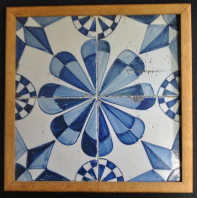 Niederländische Fliesen, Sternfliesen mit Sternecken und Rosetten, Ende des 18. Jahrhunderts. 26 x 26 cm.Gerahmt.