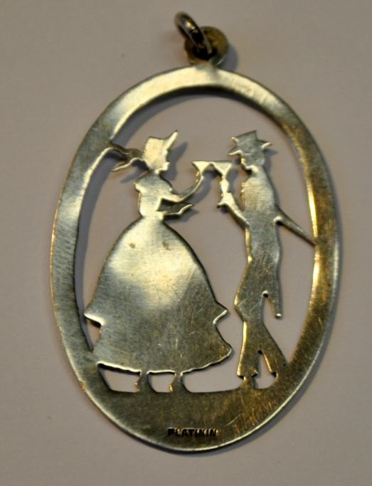 Anhänger aus Platin, 20. Jahrhundert. Oval. Mit Mann und Frau beim Toasten. Gestempelt. Höhe: 4 cm.Bestellnummer: 27292