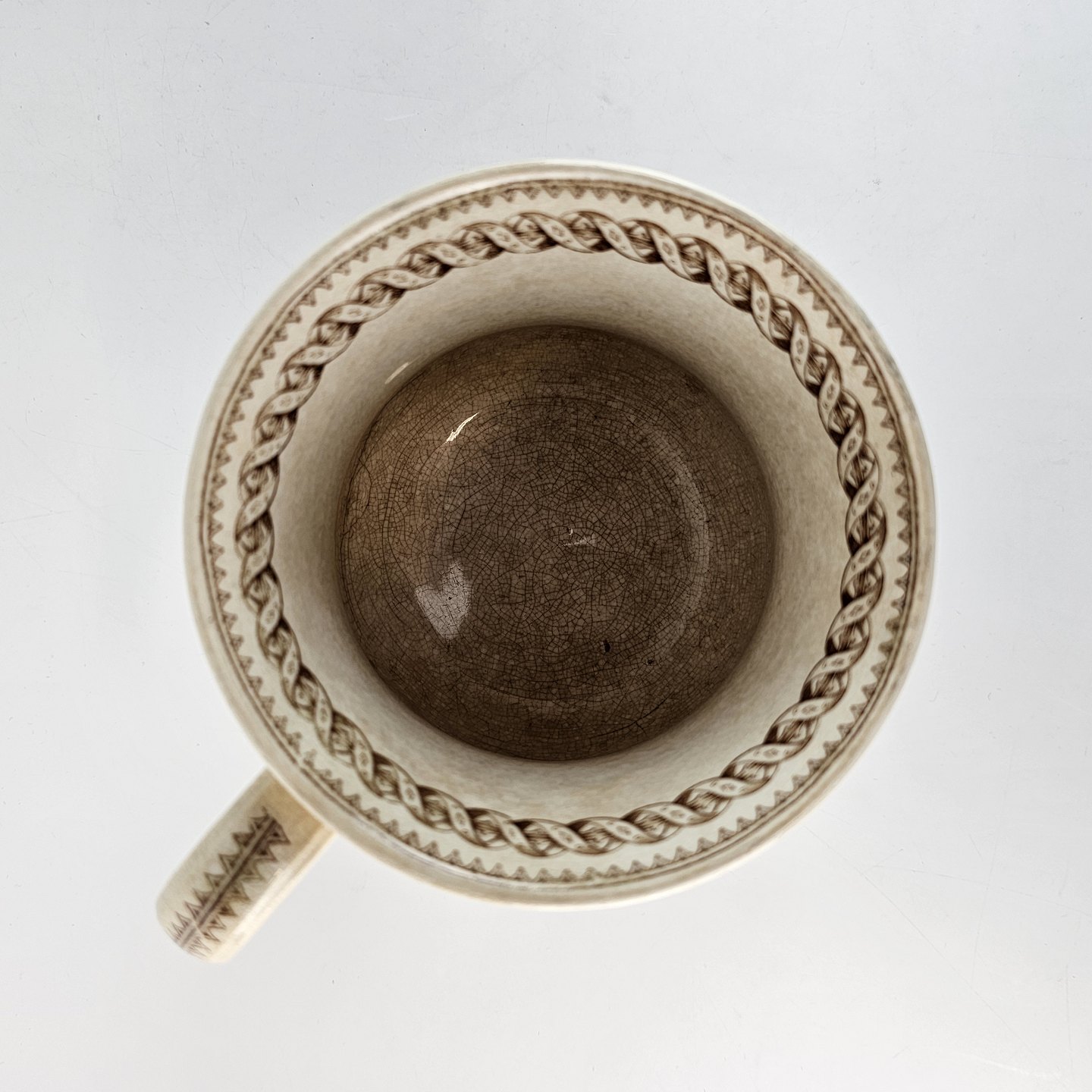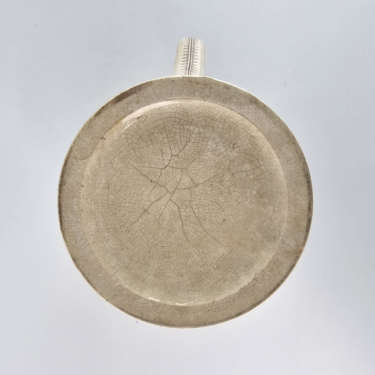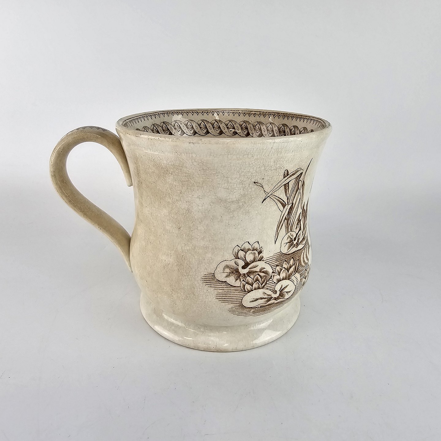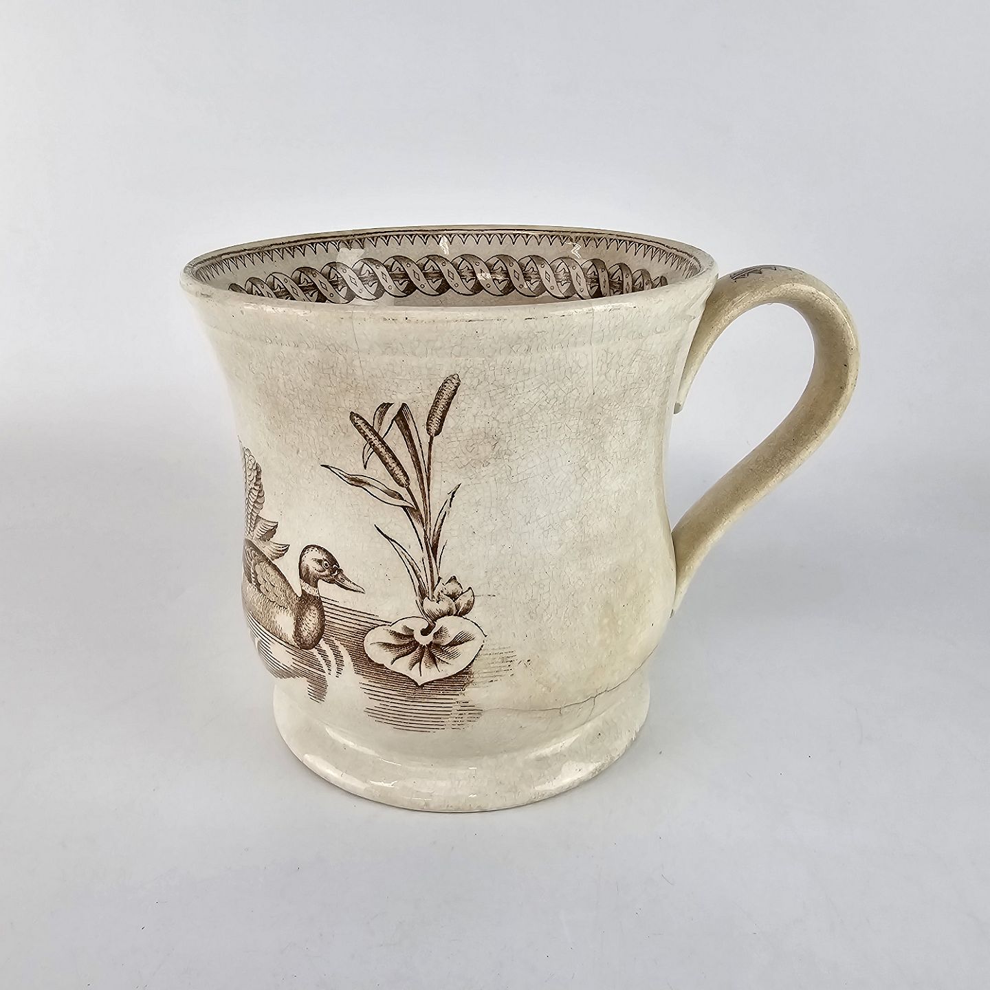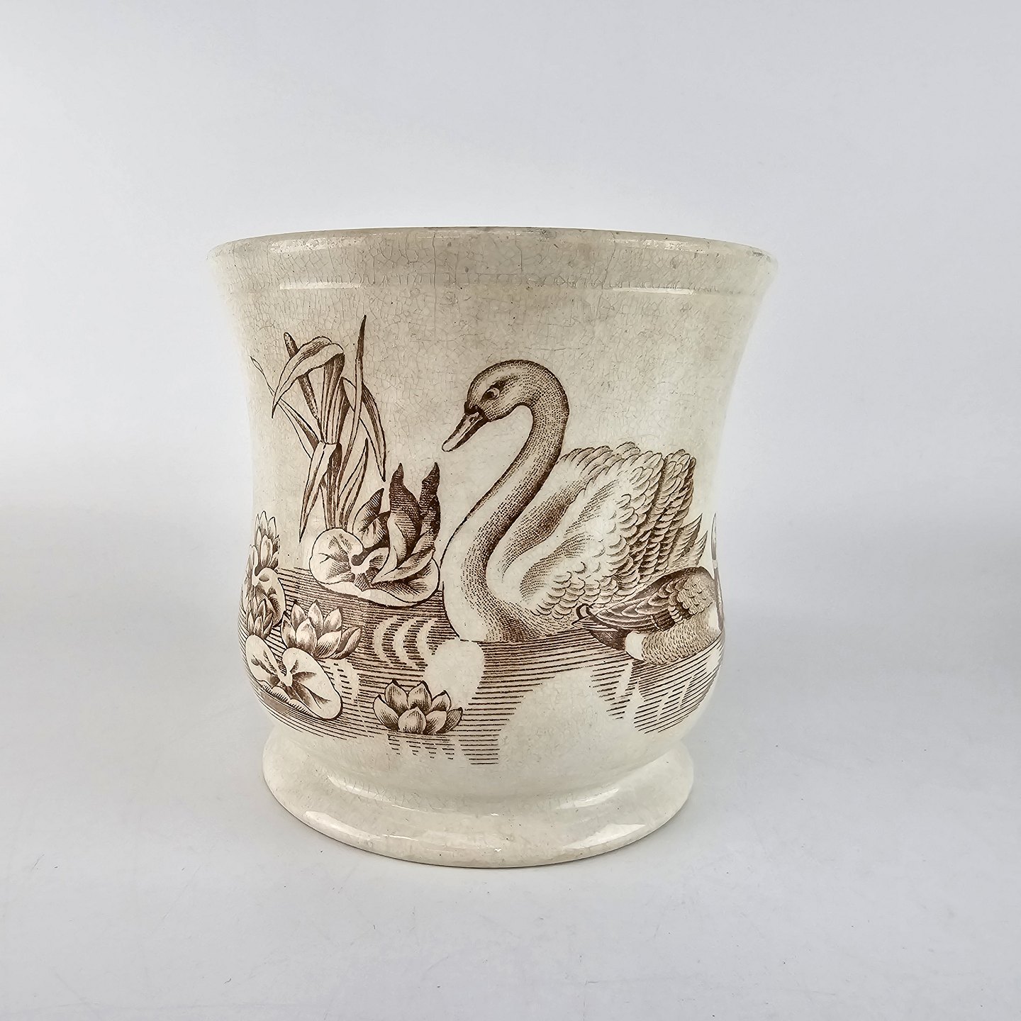 Antikt ølkrus af fajance, også kendt under navnet portlandskrus. Dekoreret med motiv af en and og en svane.