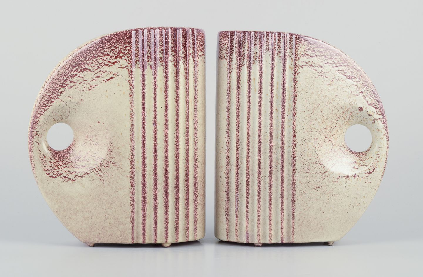 French ceramicist. A pair of Art Deco jug-shaped vases with handles.Glaze in sand-coloured and brown tones.