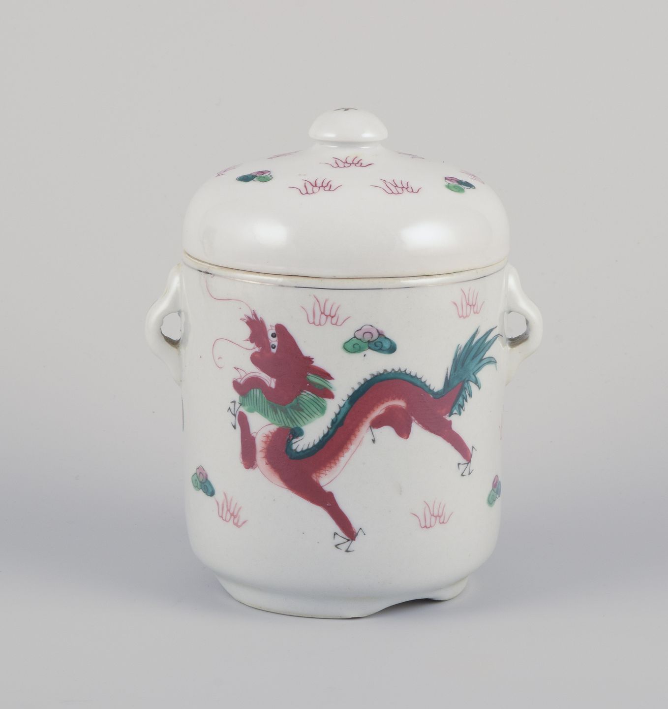 Chinese porcelain container with two lids.Hand-painted motif of dragons.