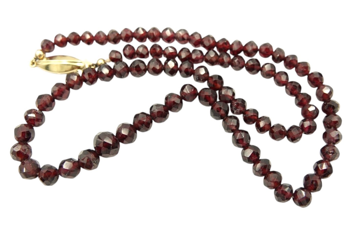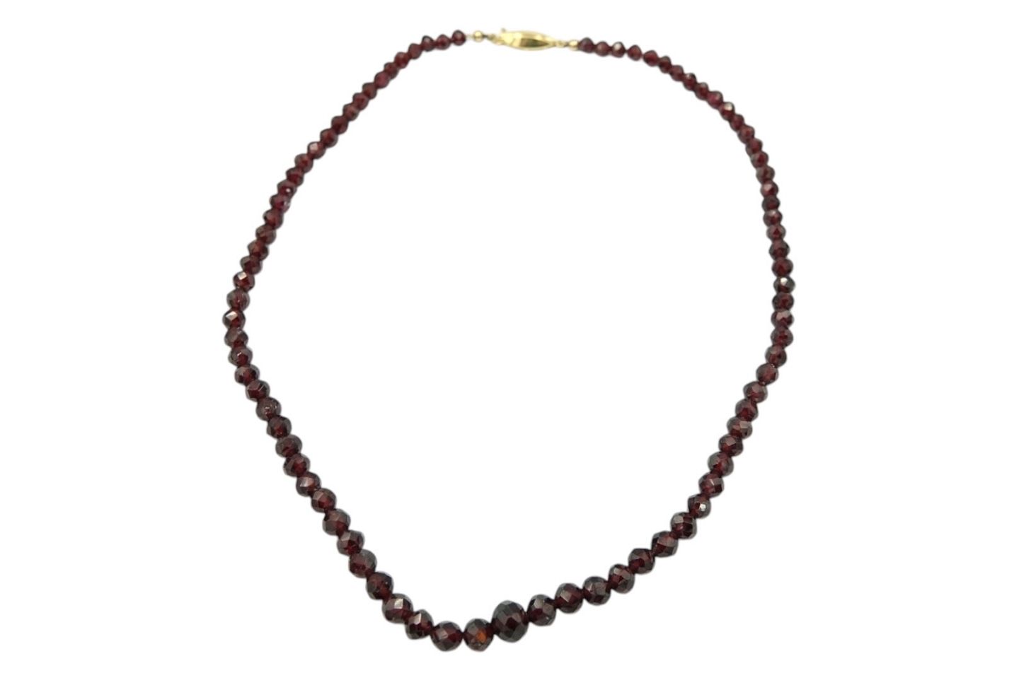 Halskæde med granater og 8 karat guld lås.Stemplet "FH FH".
