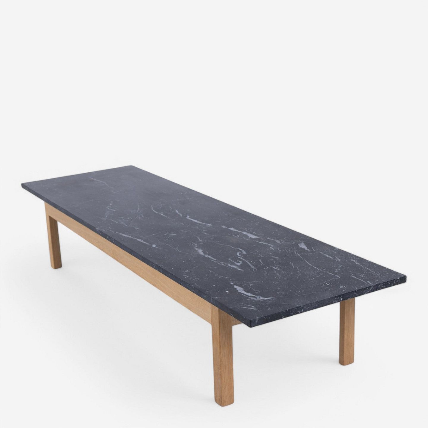 Sofabord med stel i sæbebehandlet eg og sort marmorplade.