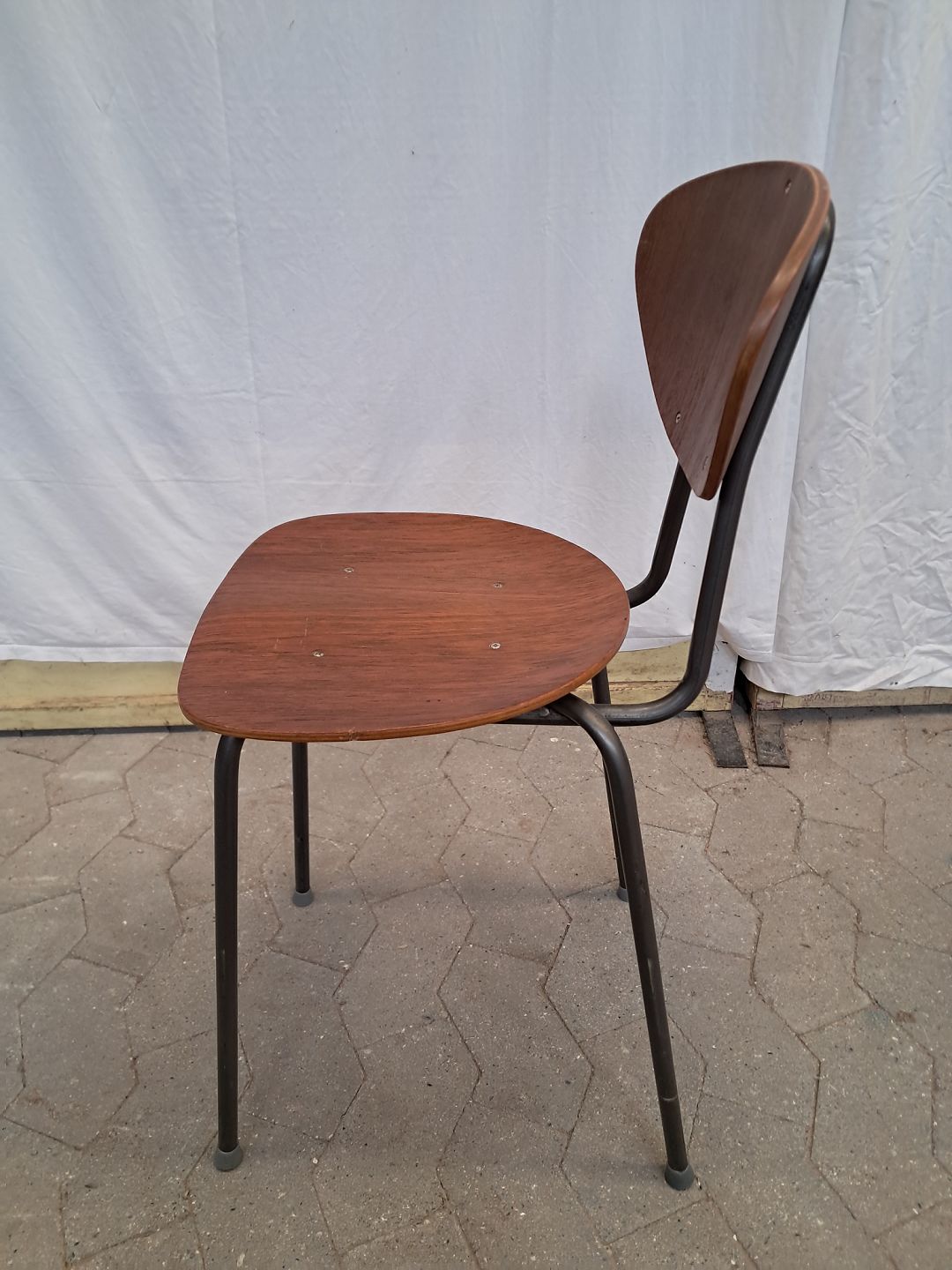 Stol i fineret teaktræ og metal, fra 1970erne.Den har brugsspor.
