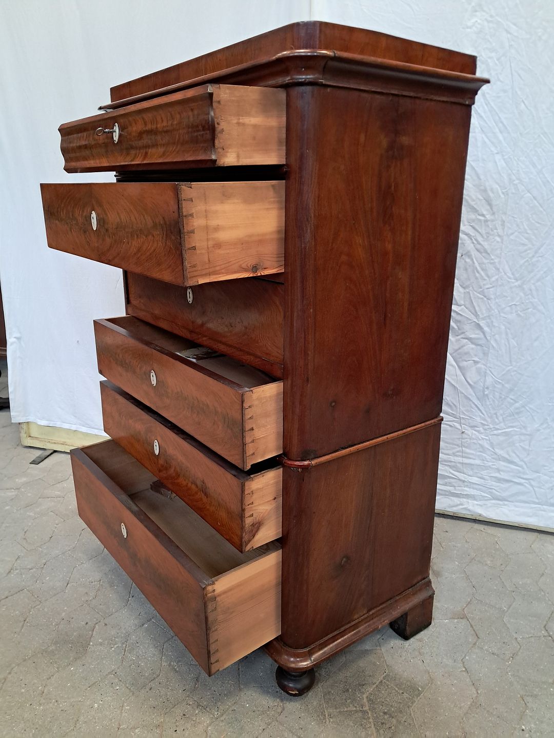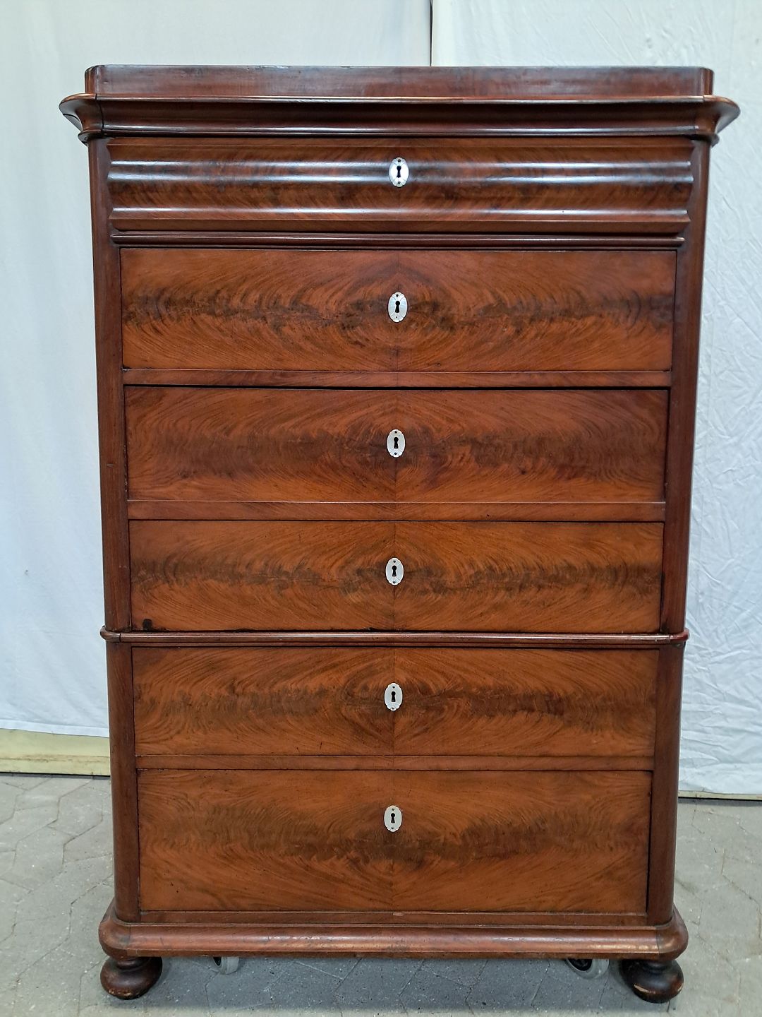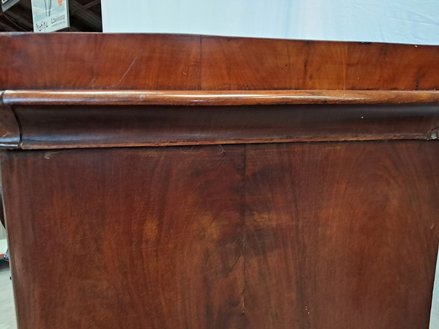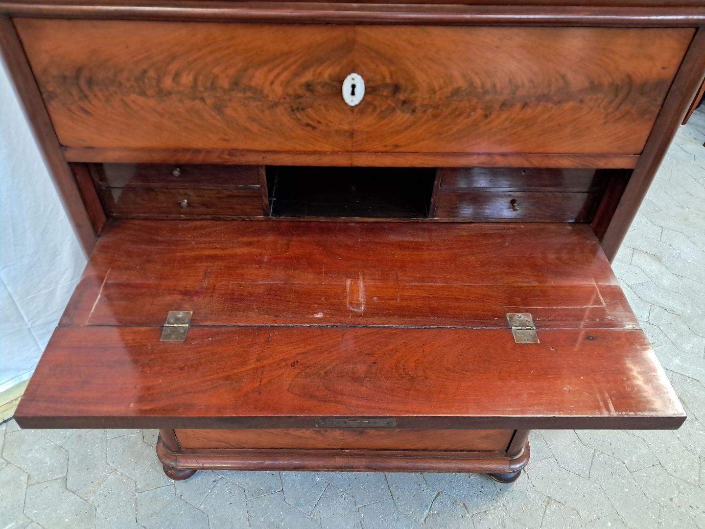 Stor kommode i fineret mahogni med skriveplads, fra 1890erne.Den har brugsspor og defekt liste.