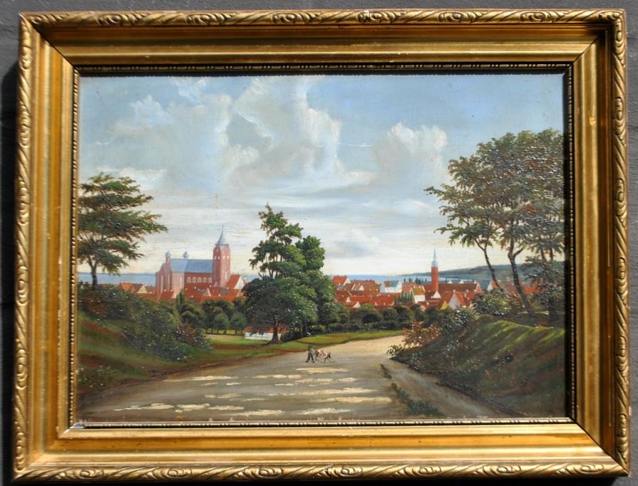 Holm, Peter (1798 - 1875) Dänemark: Aarhus im Süden mit der Kathedrale und der Abteikirche. Öl auf Metallplatte. Ohne Vorzeichen. 25 x 35 cm. Gerahmt: 32 x 42 cm. Die Stadt ist hier von der Munkegade vor dem Stadttor aus zu sehen. Der Künstler hat viele Broschüren über Aarhus angefertigt, aber soweit bekannt ist, ist dieses Werk das einzige mit diesem Motiv!Bestellnummer: 27727