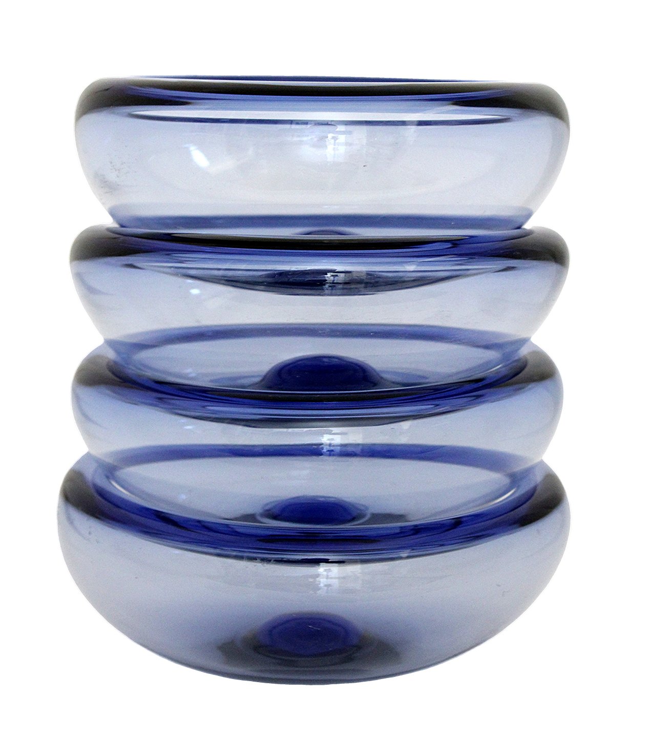 Holmegaard, Provence/Arne skåle i safirblå transparent glas. Designet af Per Lütken. Produceret fra 1955 og frem. Signeret PL18806. Diameter 17-18,5 cm. Højde 6,-7,5 cm. Almindelig brugsslid og enkelte ridser på ydersiden. Pris: 200 kr. stk. Alle 4 skåle 700 kr.