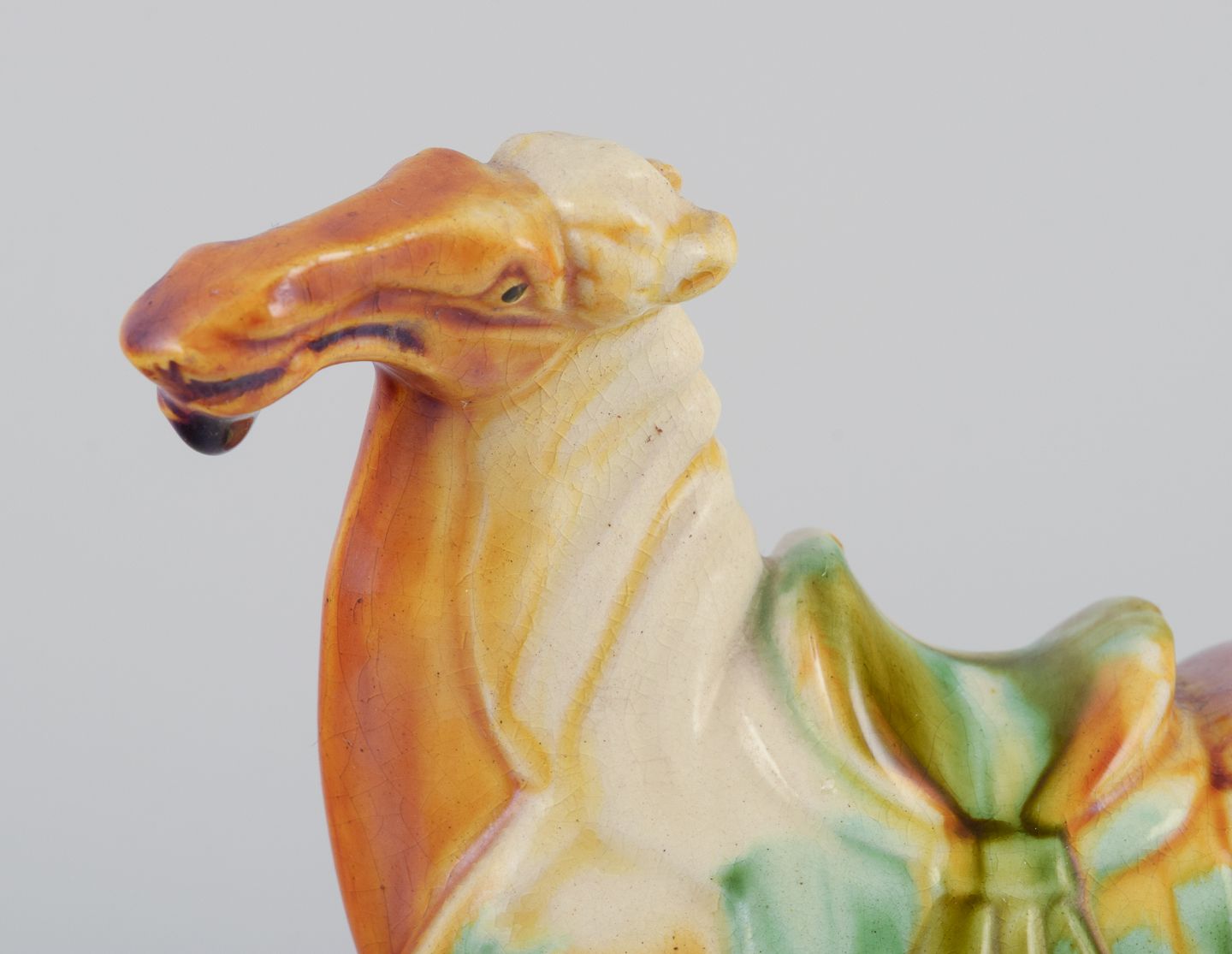 Tre kinesiske Tang heste i lertøj.Håndglaseret i brune, blå og grønne nuancer.