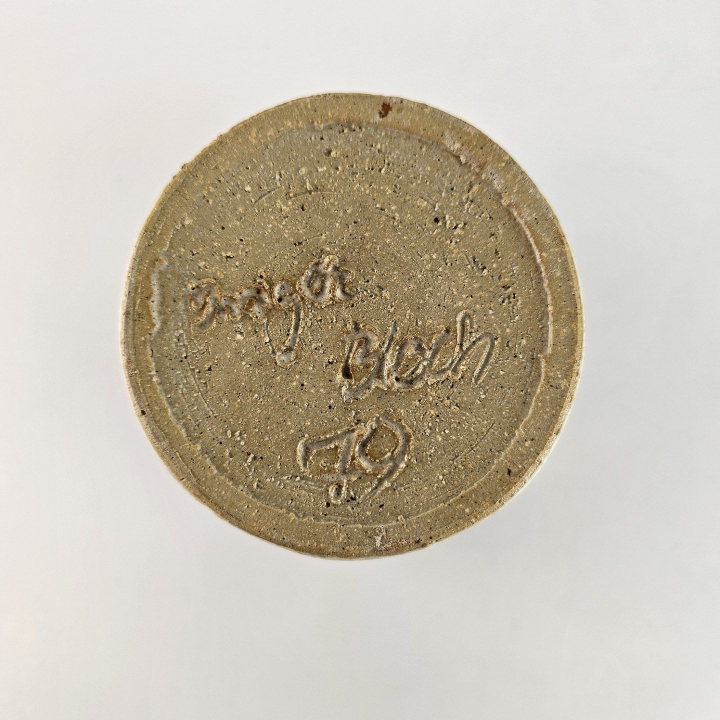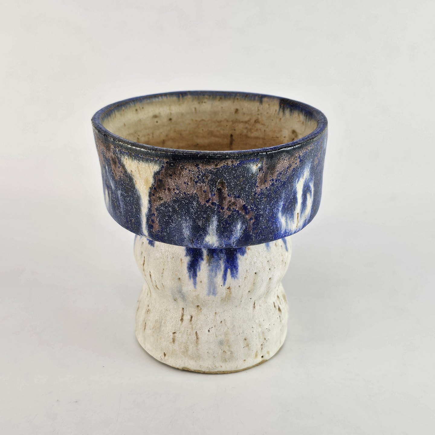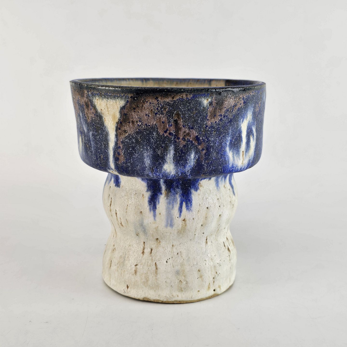 Krukke af stentøj, med to etager, i hvide og blå nuancer. Signeret Inger Bloch 79