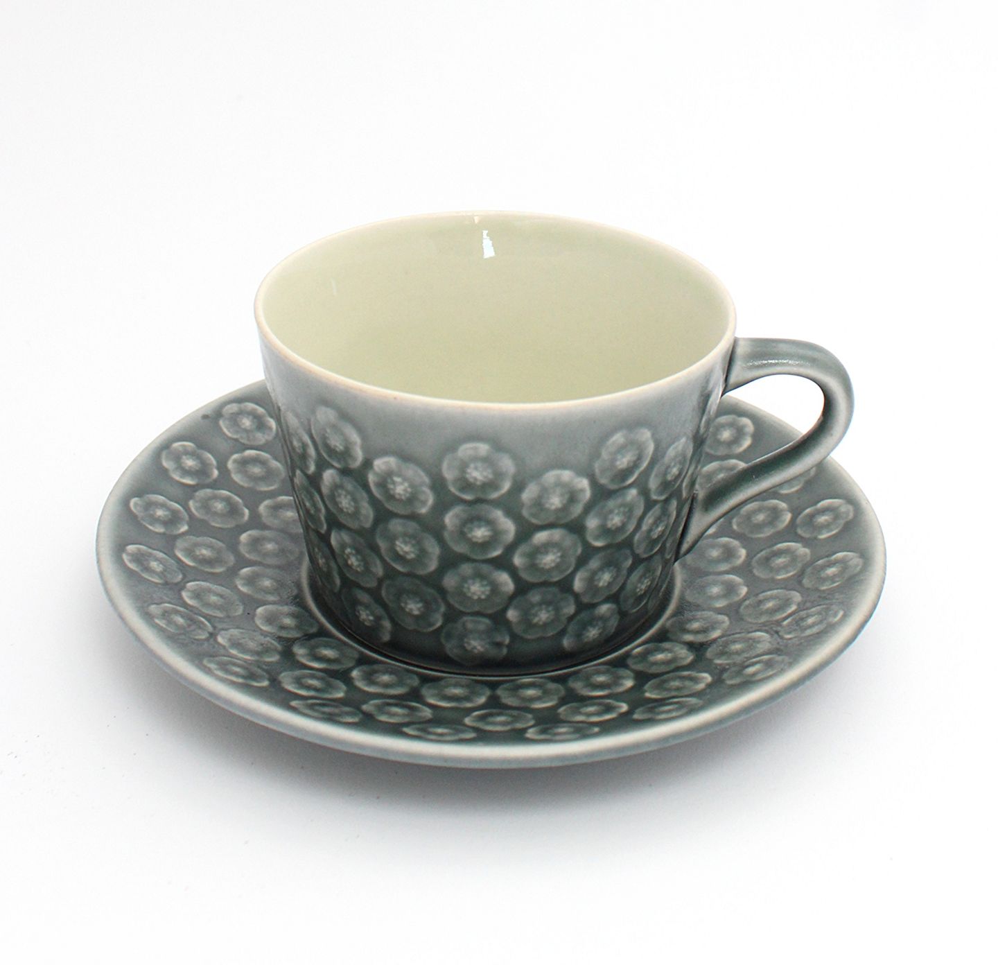 Kronjyden, Azur. Designet af Jens Harald Quistgaard i 1950'erne. Tekop med underkop. Højde 6 cm. Diameter 8,5 cm. Underkop 15 cm. Flot stand. Pris: 475 kr. stk. Lager: 6