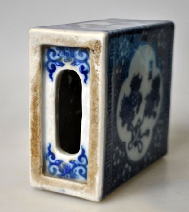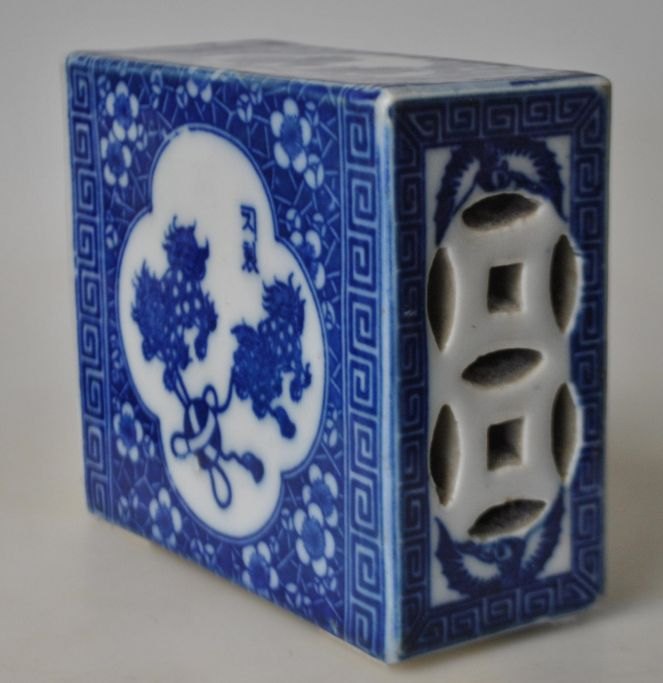 Chinesisches Kopfkissen aus Porzellan, Tongzhi, 19. Jahrhundert. Mit handgemalten blau-weißen Verzierungen aus Löwen und blühenden Zweigen. Höhe: 12 cm. B: 14 cm. D: 6 cm.Bestellnummer: 27626