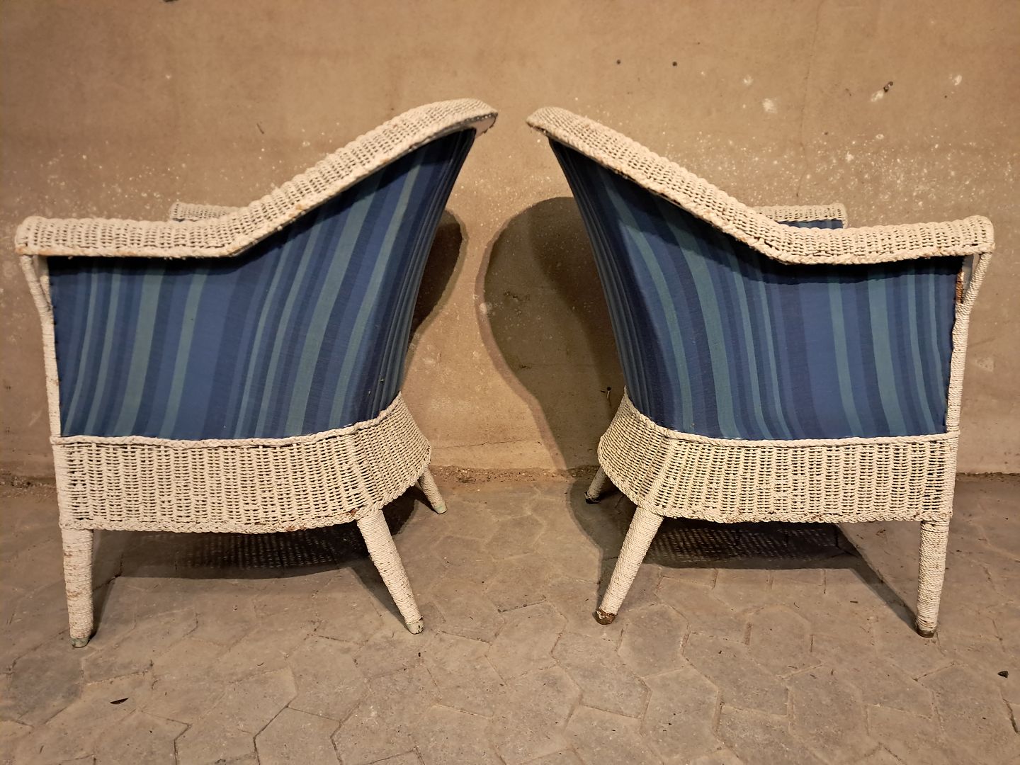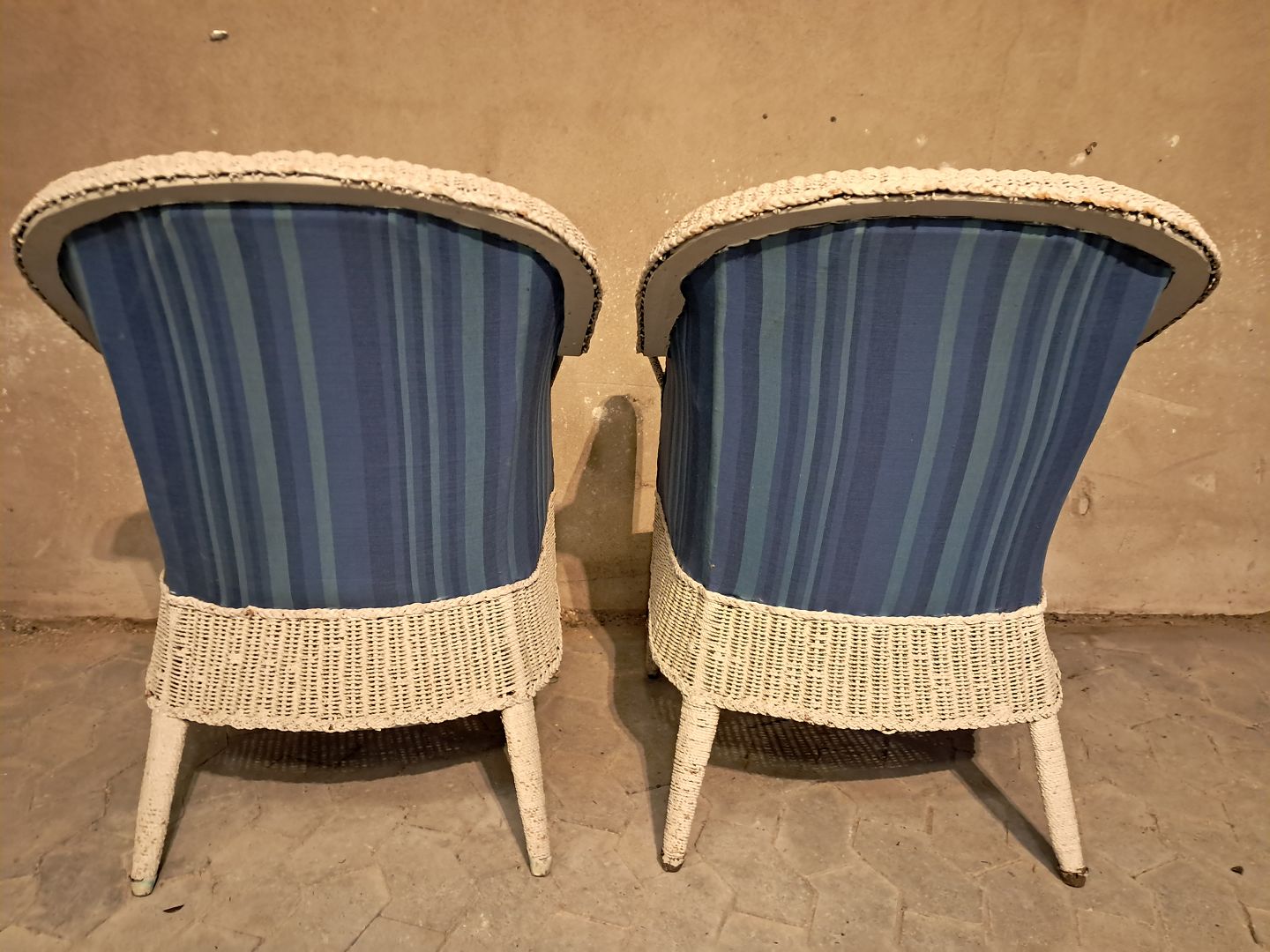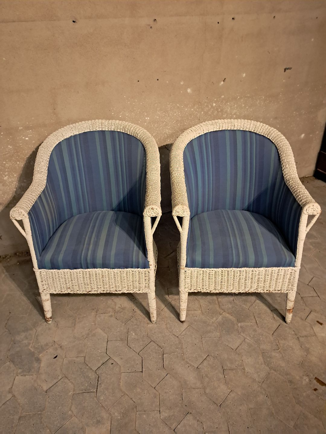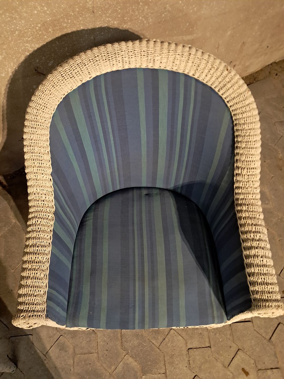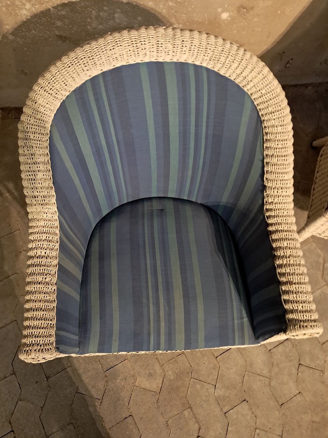 2 Malede kurvestole, fra 1980erne.Betrækket er slidt/solbleget, men intakt.