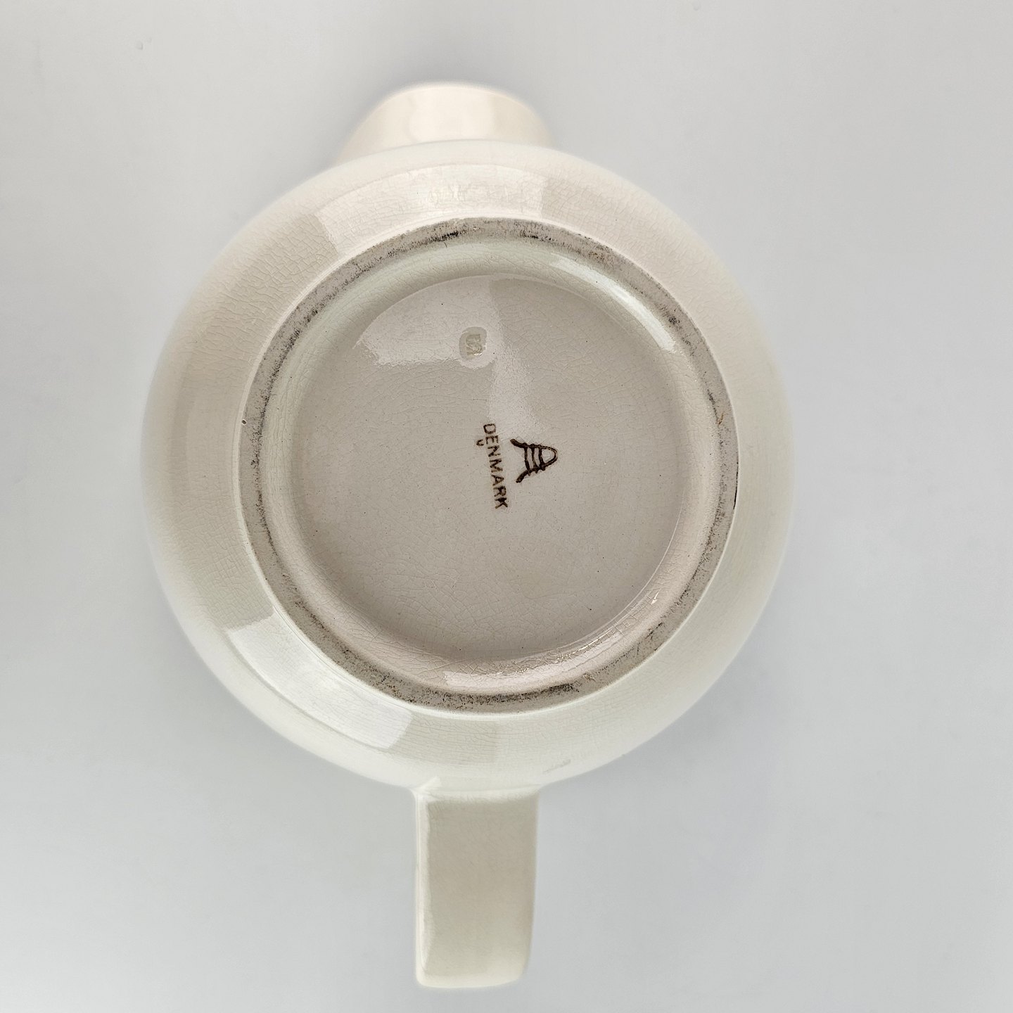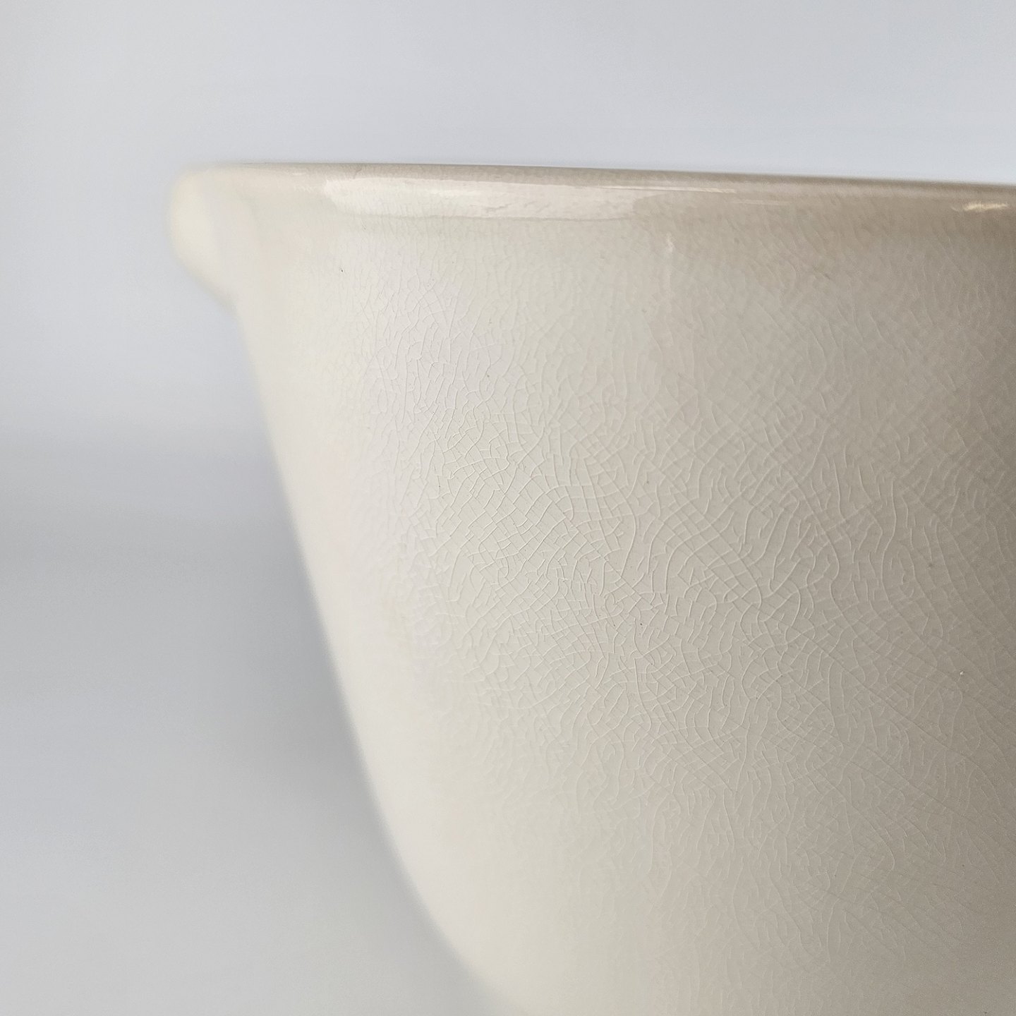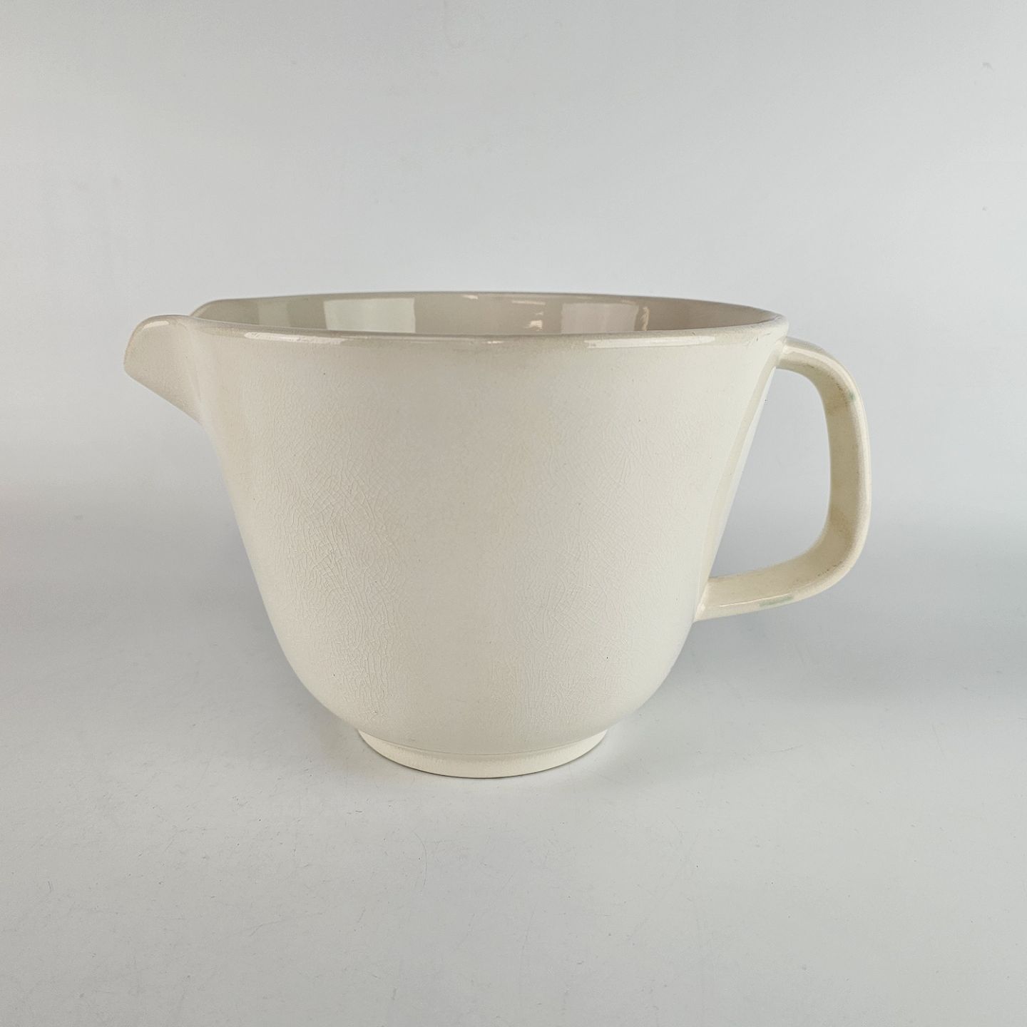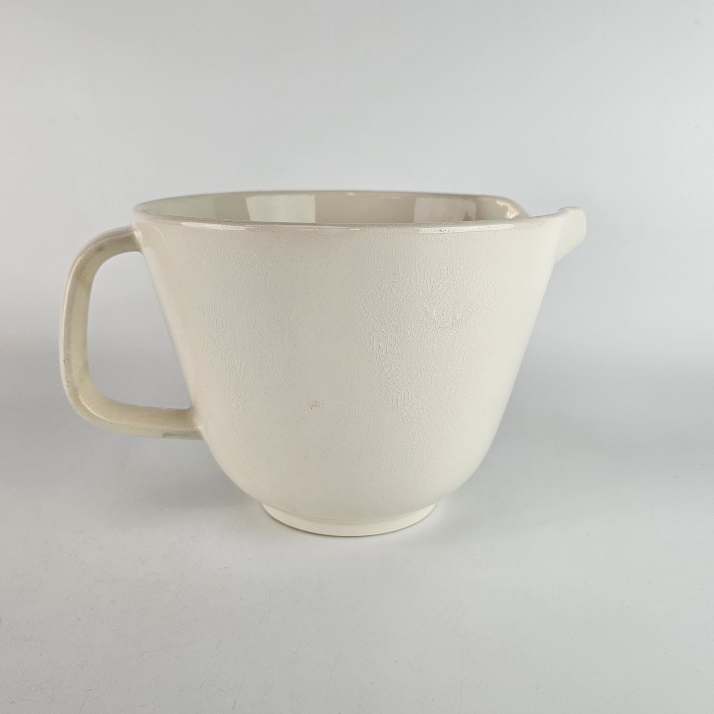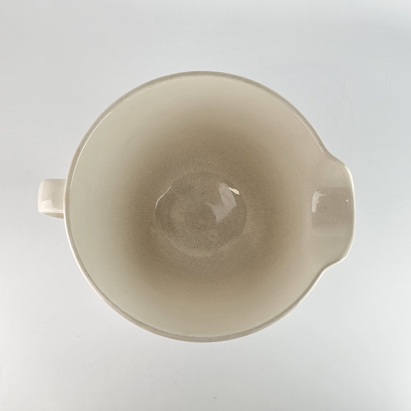 Stor røre- og piskekande af cremefarvet fajance, med krakeleret overflade.Der er en misfarvning på hanken