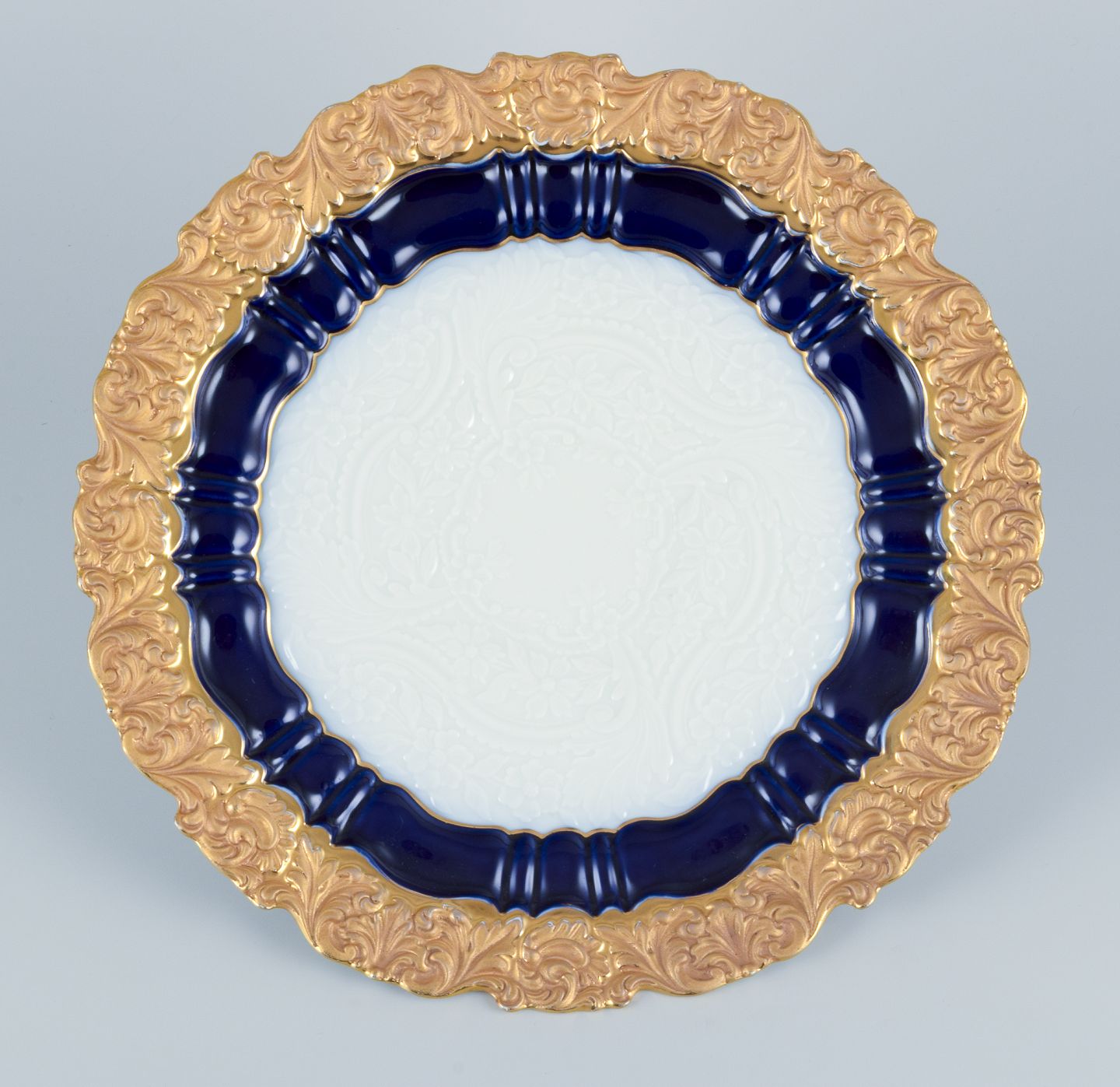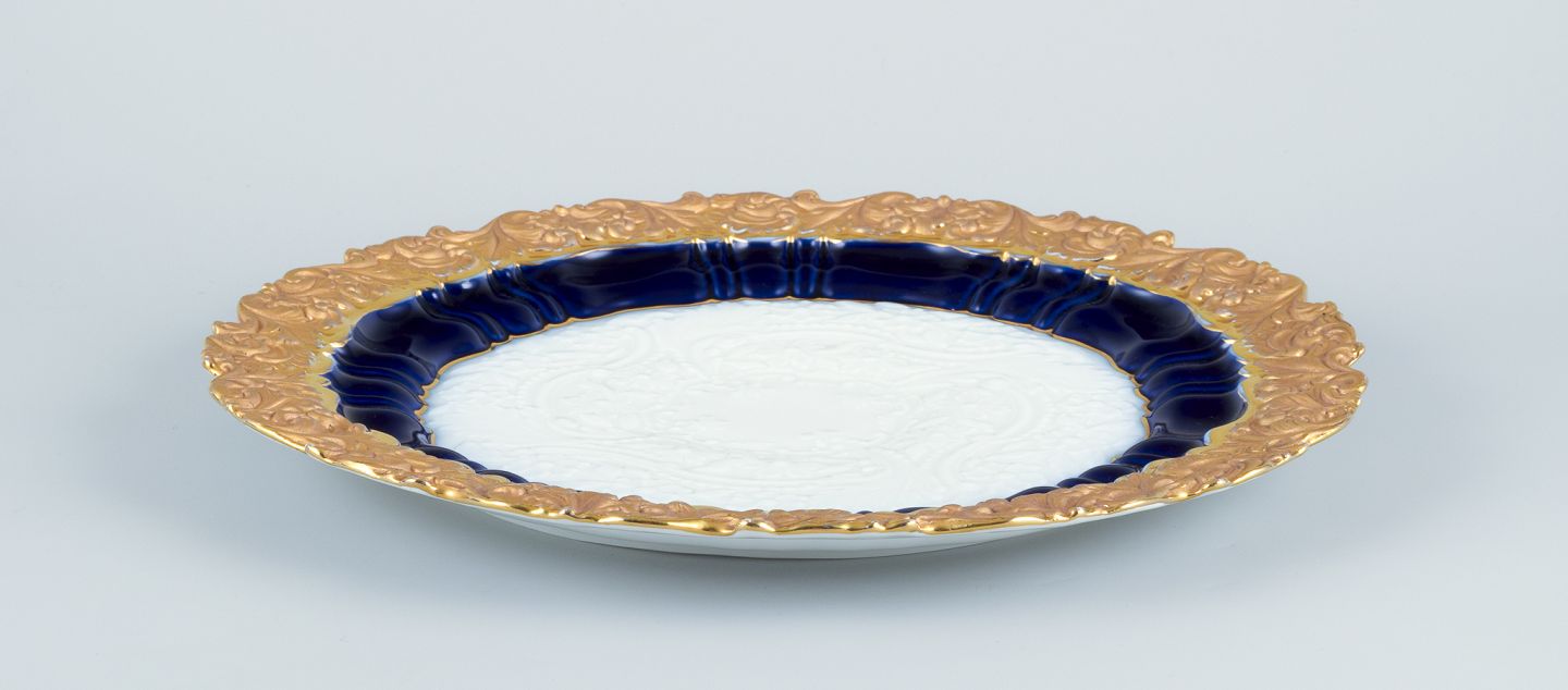 Meissen, Tyskland. Prydfad af porcelæn, dekoreret i koboltblå glasur og guld med blomstermotiv i relief, svungen kant med bladværk.Datering: Midt 1900-tallet.